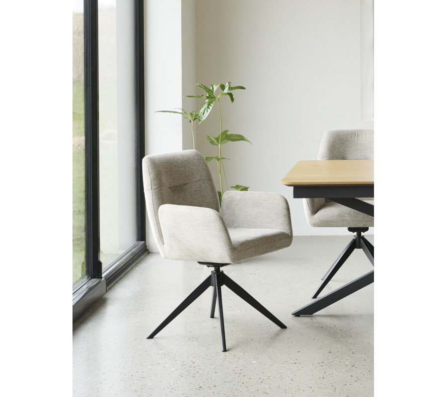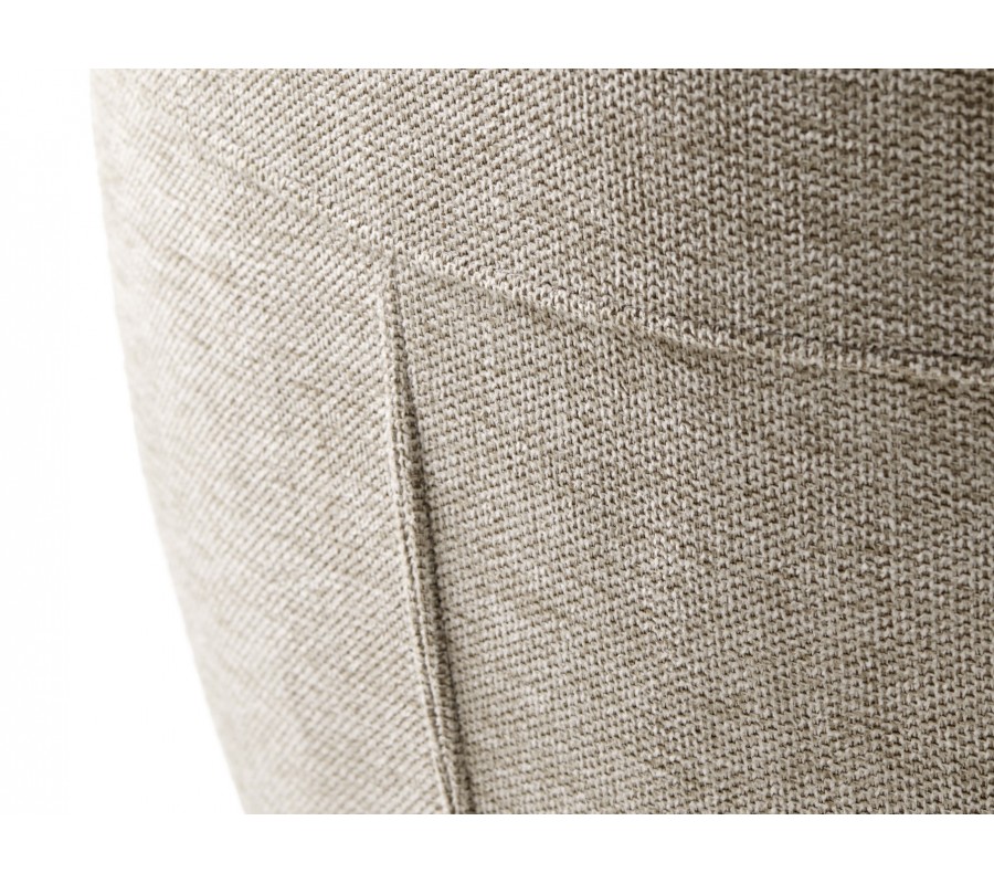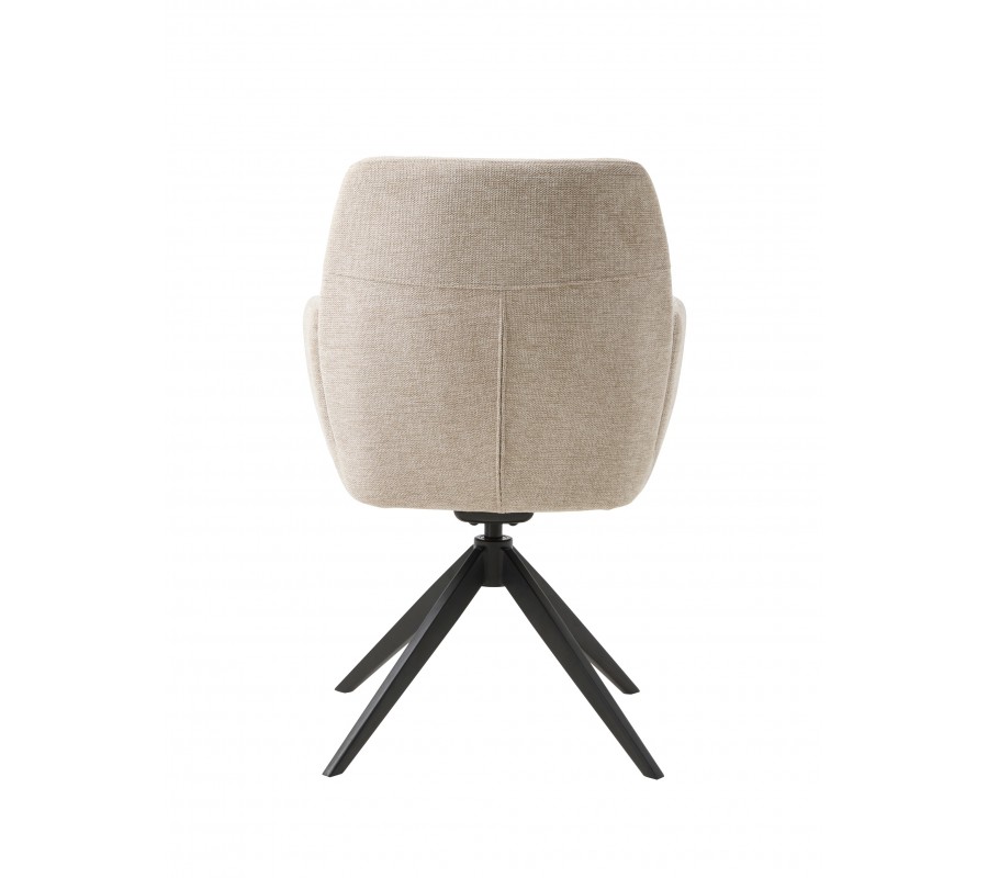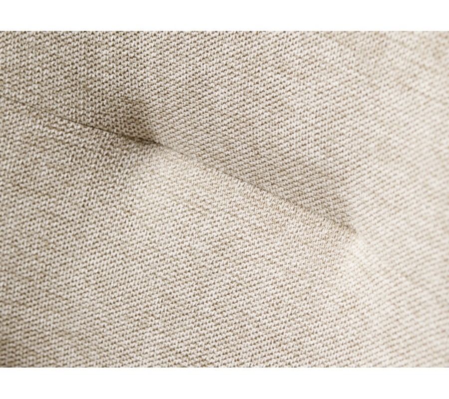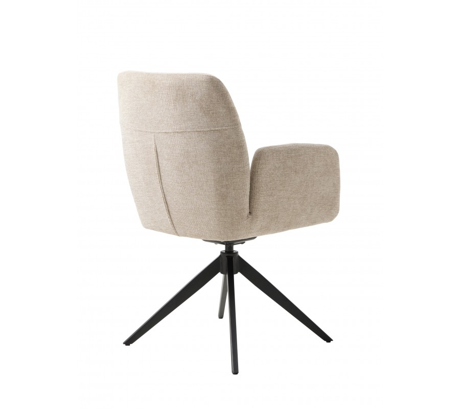 Sedadlo má obdélníkový tvar a plynule na něj navazuje hranatá opěrka zad, která je jemně nakloněna pro pohodlnější opření. Po bocích se nacházejí nižší opěrky na ruce rovnou vrchní stranou. Nejsou propojeny s opěrkou, čímž celek působí snadno a vzdušně. Sedací část pokrývá měkké pěnové čalounění, které zaobluje celkové kontury a rohy židle. Potah z odolného mikrovlákna je ideální i pro každodenní intenzivní používání. Jemně strukturovaný povrch s melírovaným efektem v kombinaci se světlým pískovým béžovým odstínem dodává židli elegantní charakter.