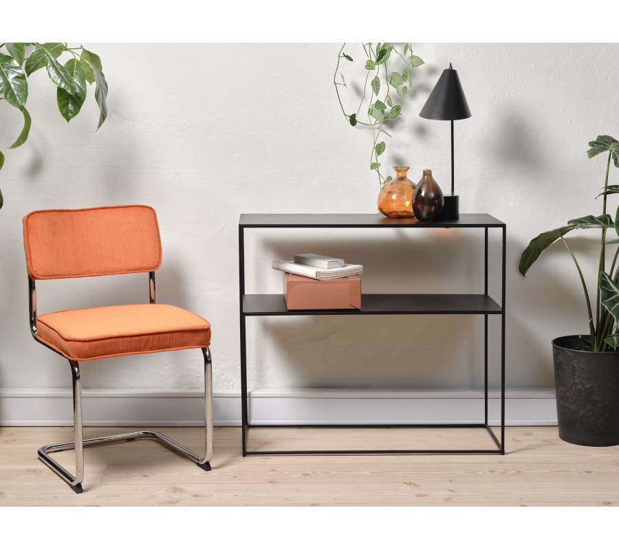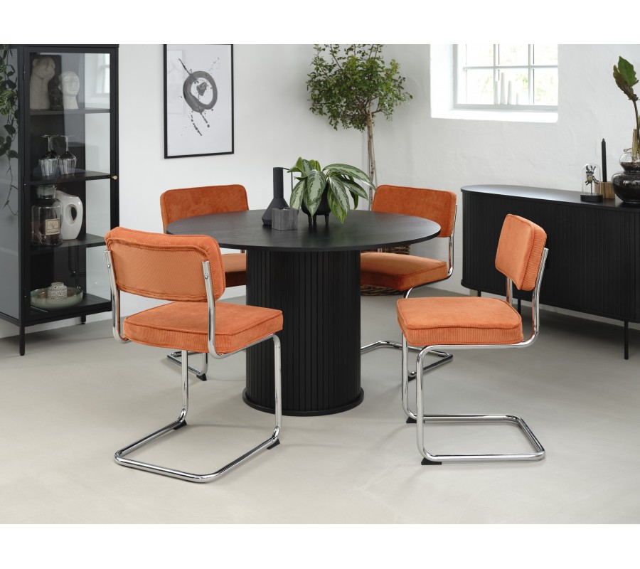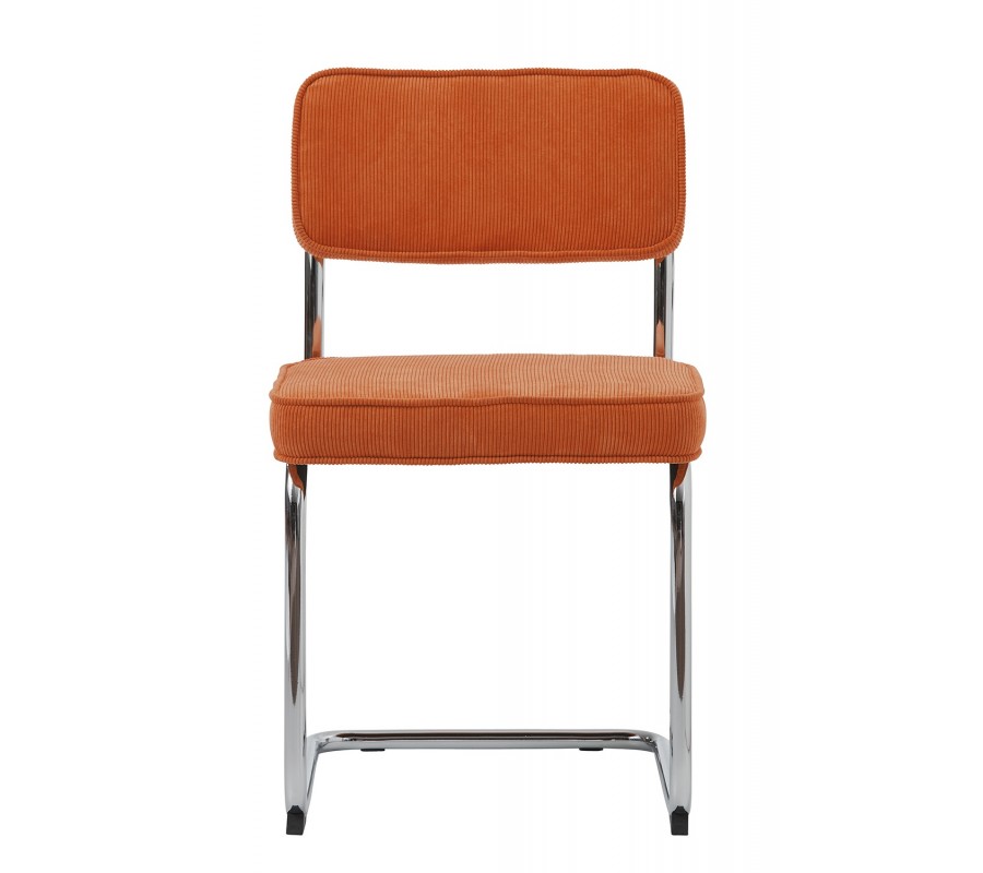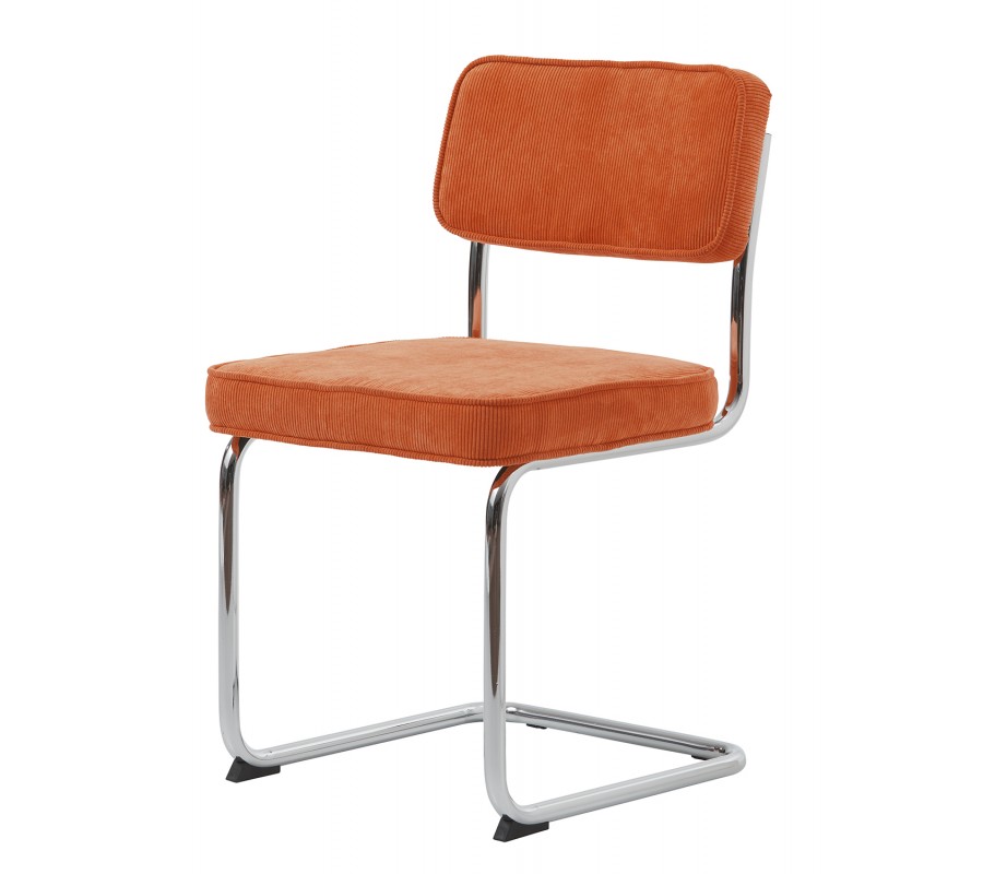 Konstrukce židle je vyrobena z pevného kovu s moderní chromovou povrchovou úpravou. Manšestrový potah ve výrazné oranžové barvě vytváří teplý akcent k rámu, je příjemný na dotek a díky mikrovláknu i mimořádně odolný.