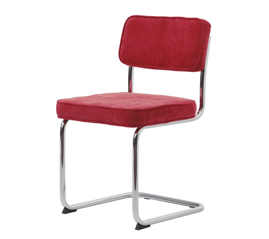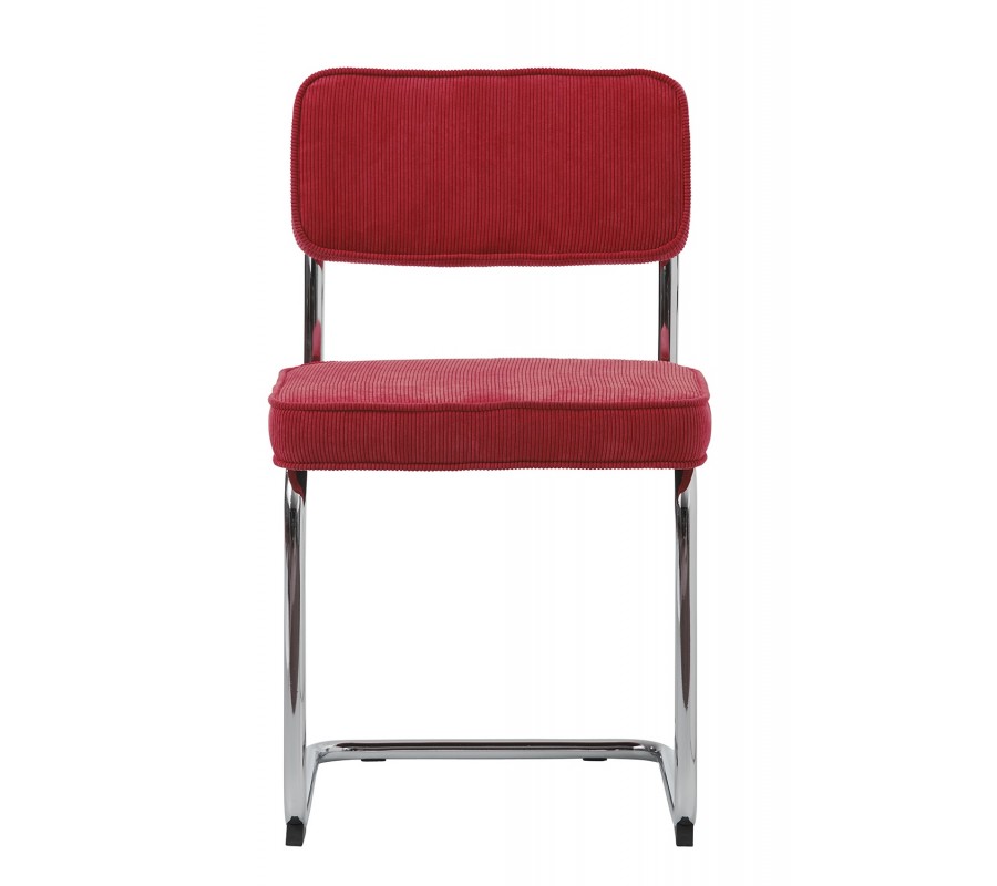 Konstrukce je vyrobena z odolného kovu s lesklou chromovou úpravou, která podtrhuje její moderní charakter. Menčestrový potah v syté červené barvě vytváří teplý kontrast k rámu, je příjemný na dotek a díky mikrovláknu i velmi odolný při každodenním používání.