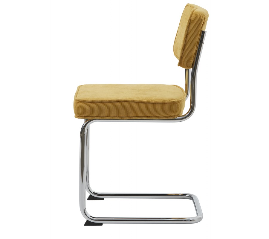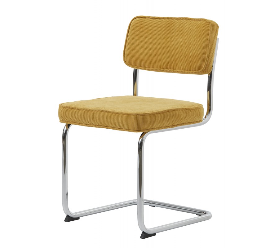 Pevná konstrukce je zhotovena z kovu s lesklým chromovým povrchem, který zvýrazňuje její moderní vzhled. Menčestrový potah ve žluté barvě vytváří teplý kontrast k rámu, je příjemný na dotek a díky mikrovláknu je odolný a zachová si svůj vzhled i při intenzivním každodenním používání.