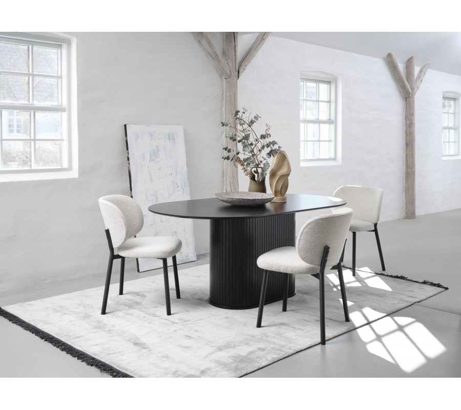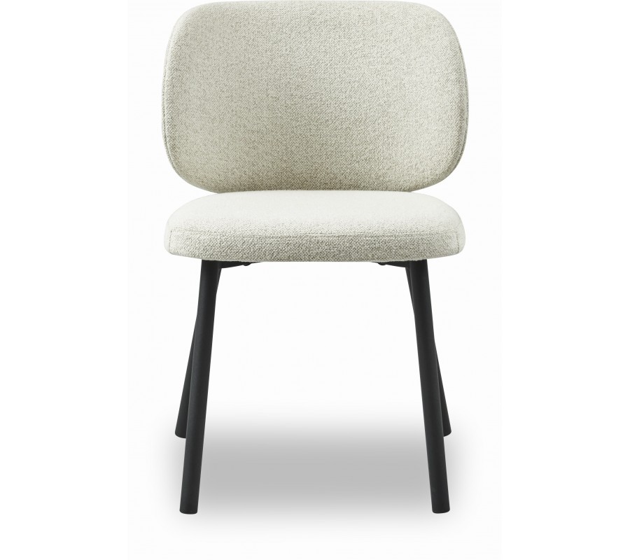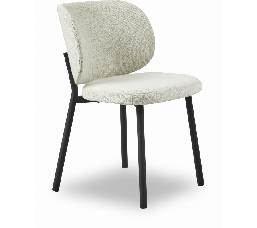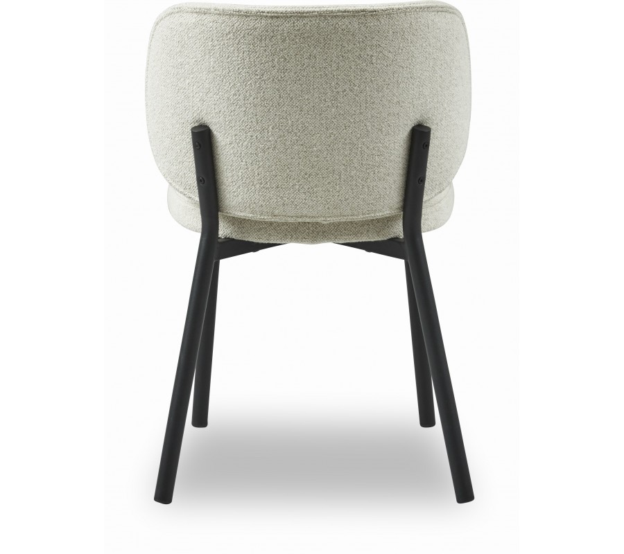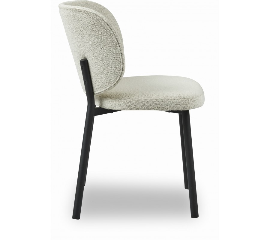 Sedadlo i opěrka jsou vyplněny kvalitní pěnovou výplní a potaženy odolnou textilií z mikrovlákna, které je ideální pro každodenní používání. Povrch má charakteristickou smyčkovitou buklé strukturu, příjemnou na dotek s útulným a měkkým vizuálem. Sivobílá barva v off-white odstínu dodává židli lehký a elegantní vzhled.