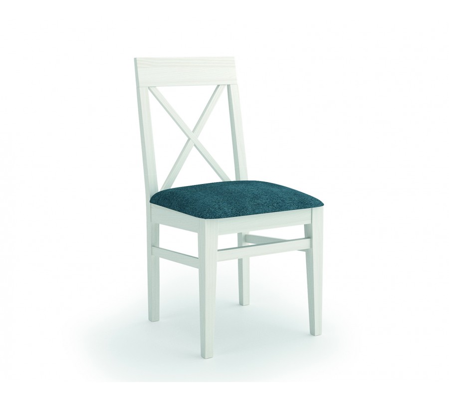Židle má moderní siluetu, ve které dominují rovné linie a geometričnost tvarů. Čalouněné sedátko s textilním potahem má obdélníkový tvar a zaručí komfortní sezení. Je položeno na dřevěném rámu, ze kterého vycházejí čtyři hranaté nožičky. Zadní pár plynule přechází do bočních stran opěrky a ve vrchní části je ukončen širší obdélníkovou deskou. Opěrka je mírně zahnutá dozadu a při sezení se tak dobře přizpůsobí tělu. Vyplňuje ji výztuha ve tvaru X, která v kombinaci se zúženou spodní částí nožiček a lineárními spojnicemi mezi nimi na bočních a předních stranách dodává moderní formě jemně venkovský výraz.