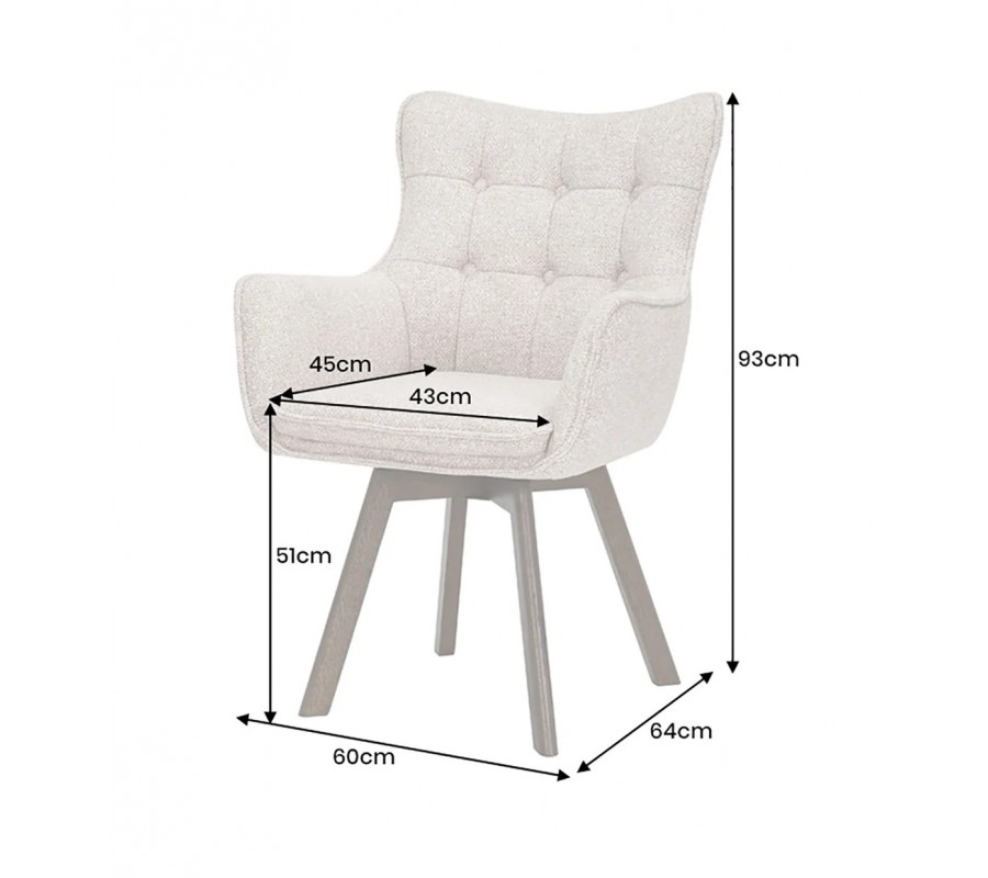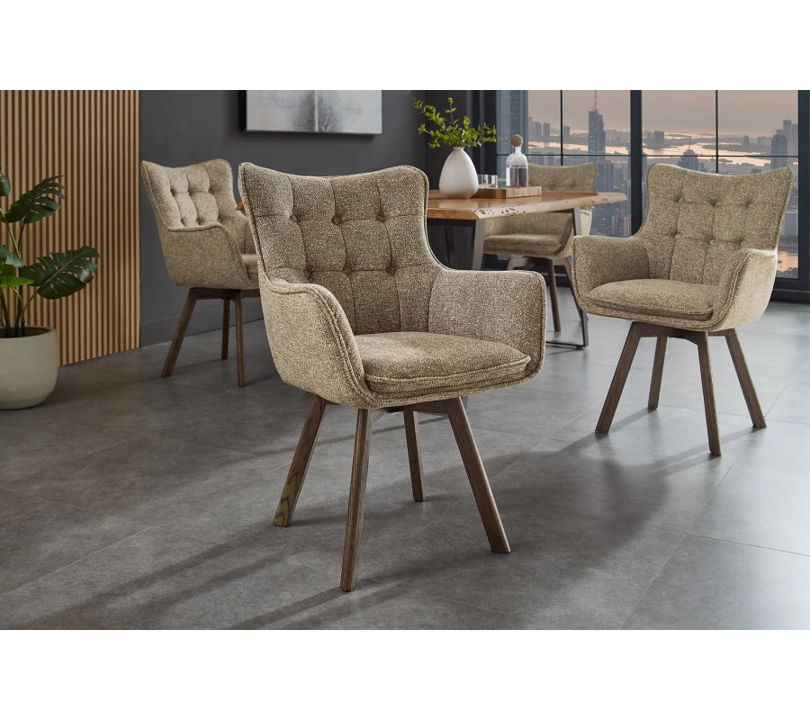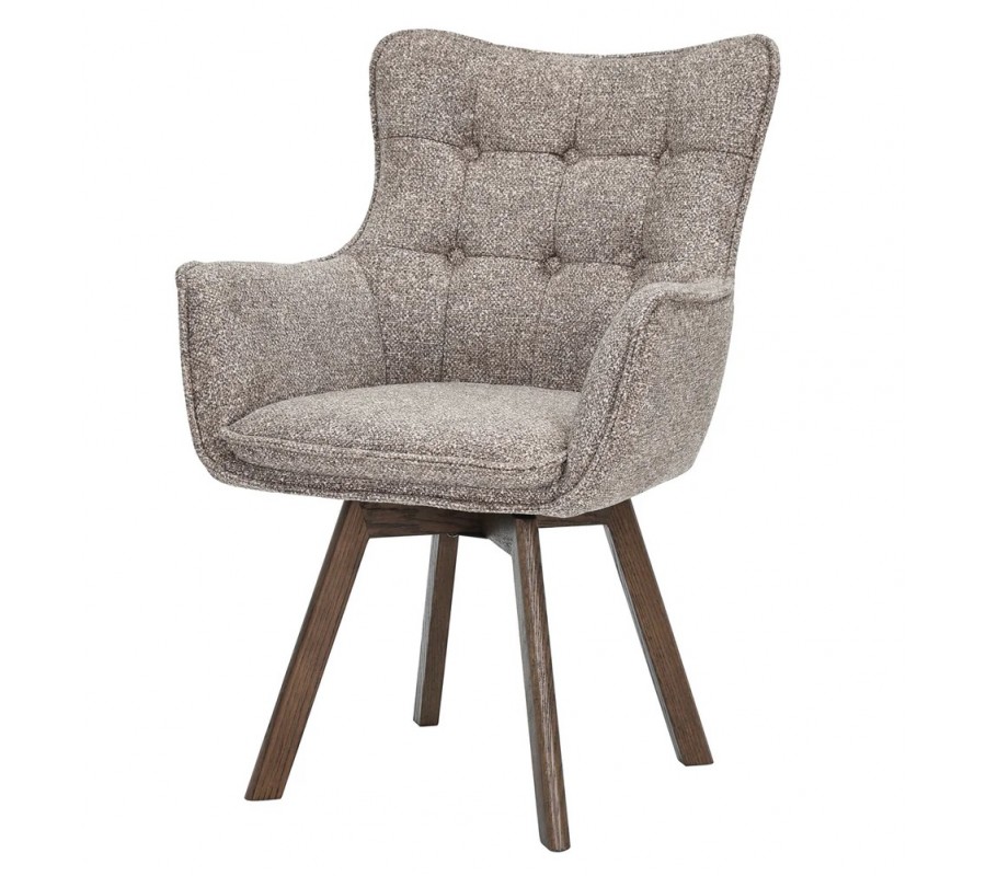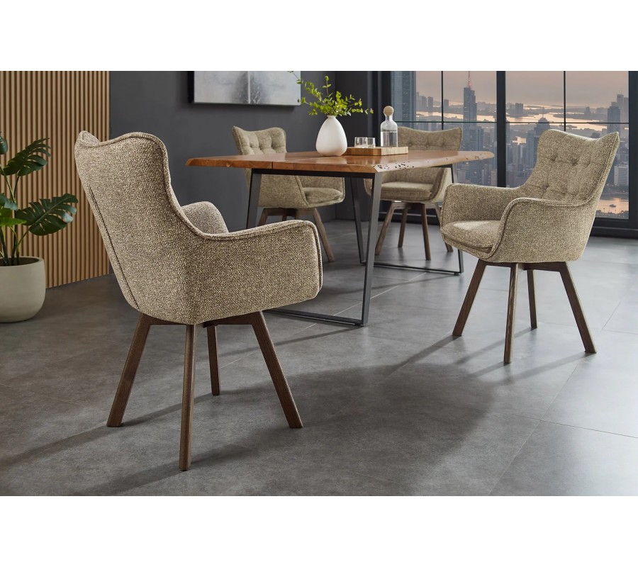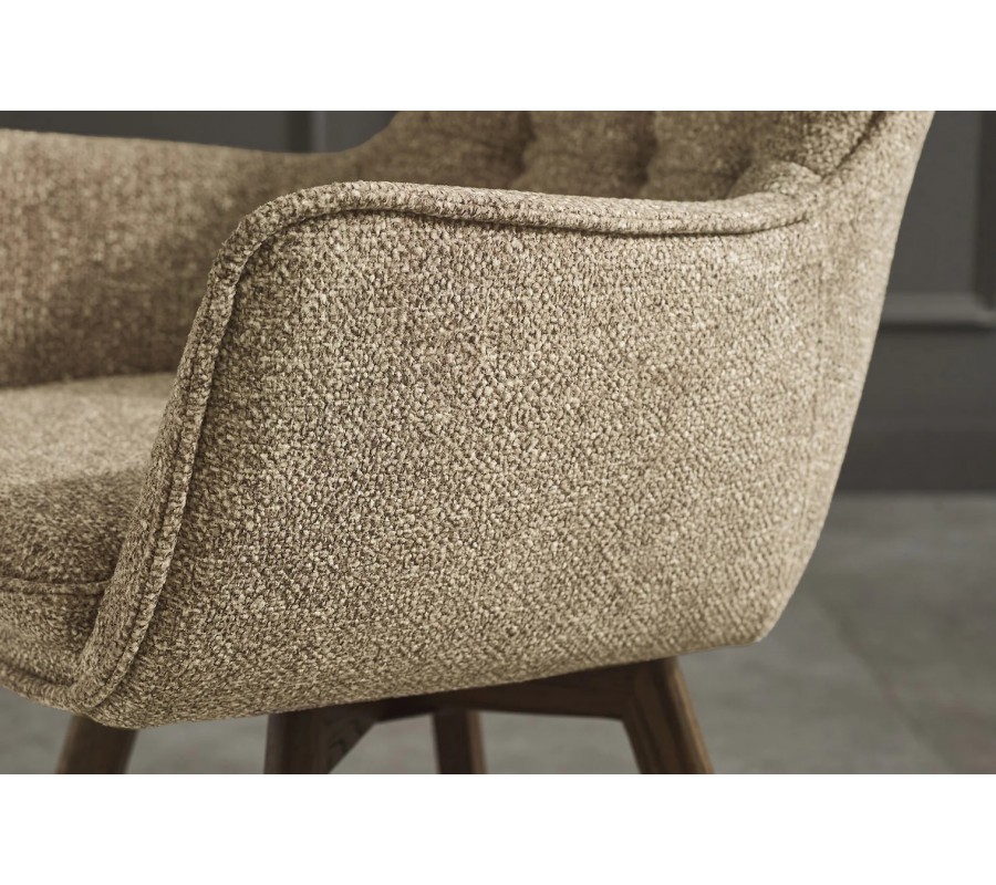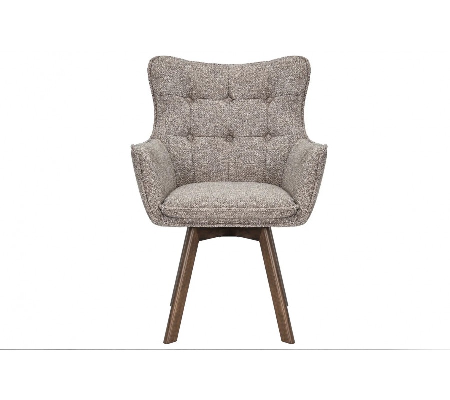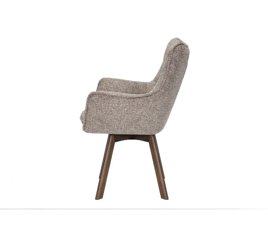 Sedací část je bohatě vyplněna paměťovou pěnou, díky čemuž poskytuje vysoký komfort při delším sezení. Stabilitu zajišťují čtyři hranaté nožičky z masivního dubového dřeva v tmavě hnědé barvě. Jejich tvarování a přírodní kresba zvýrazňuje kvalitu materiálu. Do nožiček je integrován otočný mechanismus, který umožňuje otáčení křesla o 360 stupňů.