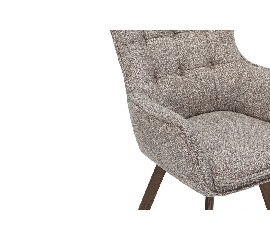 Má výraznou siluetu ušákové zádové opěrky, která je v horní části rozšířená a jemně zaoblená, přičemž disponuje čalouněním s kulatými knoflíčky. Opěrky na ruce plynule navazují na celkový tvar opěradla, čímž působí kompaktně a harmonicky. Celá konstrukce je potažena šedým melírovaným mikrovláknem s výraznou strukturou, která dodává křeslu hřejivý vzhled.