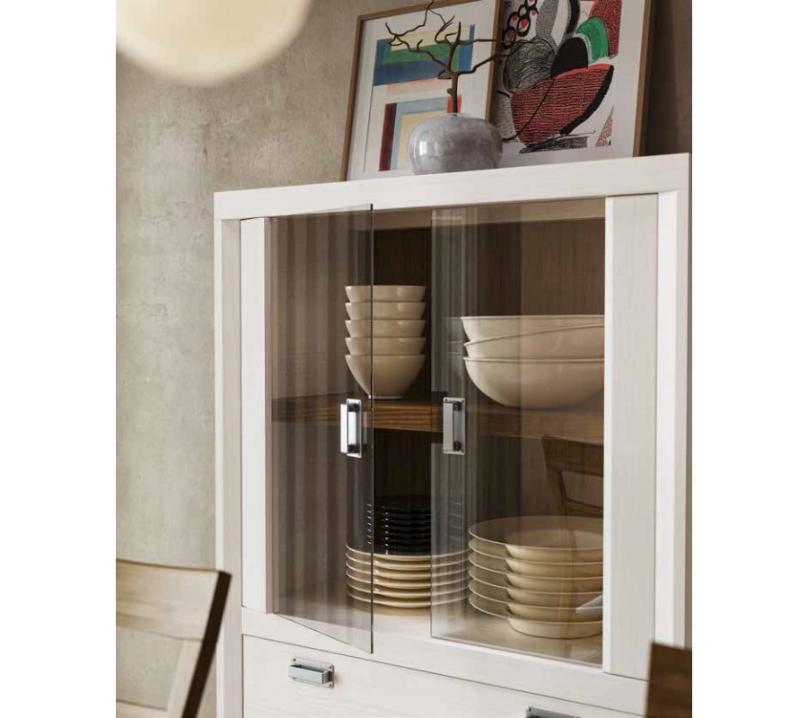Stylová vitrína z kolekce nábytku Lyon vás může zaujmout svým designem, kterému dominuje jeho mohutný masivní rám v kombinaci s jeho přírodním masivním provedením. Přímé tvaru vitríny Lyon jsou doplněny o nízké nožičky díky čemuž tento kousek nabírá velmi jemný koloniální nádech. Skleněná dvířka vitríny vytváří určitou jemnost, která vytváří krásný kontrast se zmíněným mohutným rámem. Tento kousek inspirovaný moderními trendy nabízí kromě skleněných dvířek s vnitřní poličkou také dvě rozměrné a praktické zásuvky s kovovými rukojeťmi. Nízká vitrína Lyon může být využita také jako příborník a díky možnosti volby barevného provedení dřeva i moderních rukojetí si můžete upravit tento produkt tak, aby vynikl ve vašem interiéru a vyhověl každému vašemu požadavku.