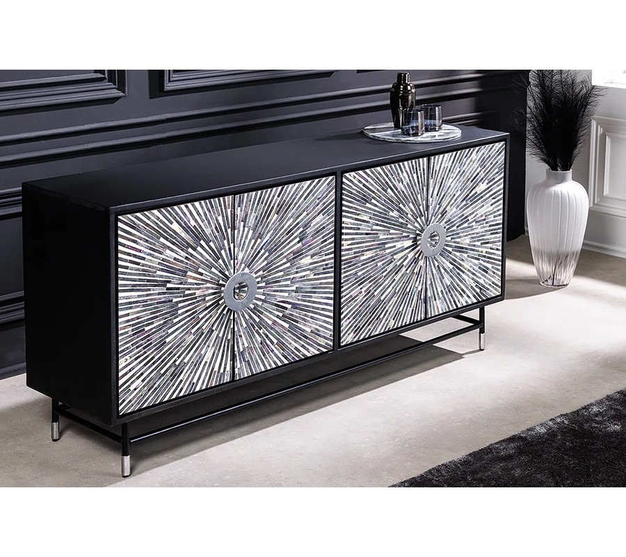 Luxusní art deco obdélníkový čtyřdveřový příborník Hueso s mozaikou z buvolí kosti v černobílé barvě 160cm