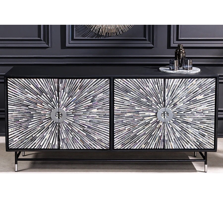 Dvířka příborníku zdobí výrazný motiv paprsků, který spolu s kulatými stříbrnými kovovými úchyty působí elegantně, harmonicky a typicky art-deco. Úchytky jemně doplňují dekor a podtrhují luxusní charakter nábytku. Magnetický systém zavírání zajišťuje pohodlné používání a zároveň umocňuje pocit prémiové kvality při každém otevření.