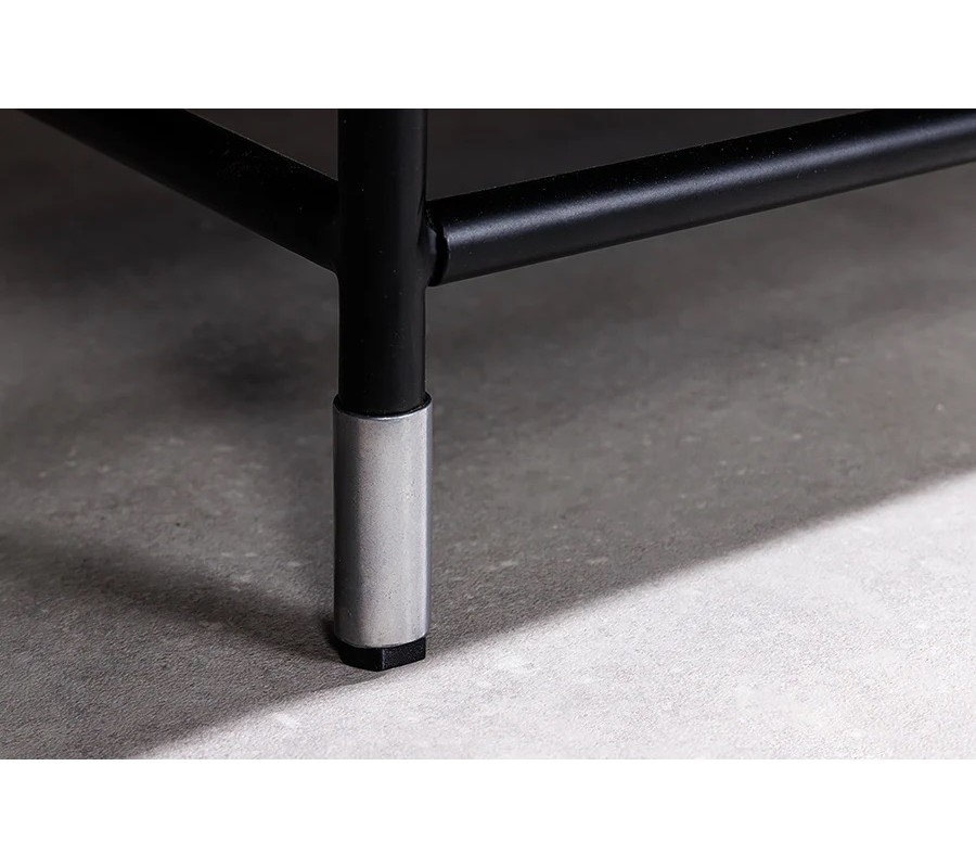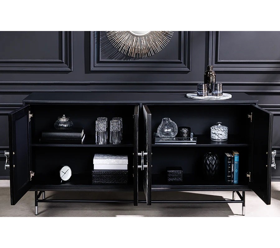 Za čtveřicí dvířek se nacházejí čtyři praktické police, které nabízejí dostatek úložného prostoru na nádobí, dekorace nebo jiné předměty. Příborník stojí na černé kovové konstrukci doplněné ostříbrné kovové nožičky, které elegantně navazují na úchyty a dodávají celku vizuální lehkost a stabilitu.