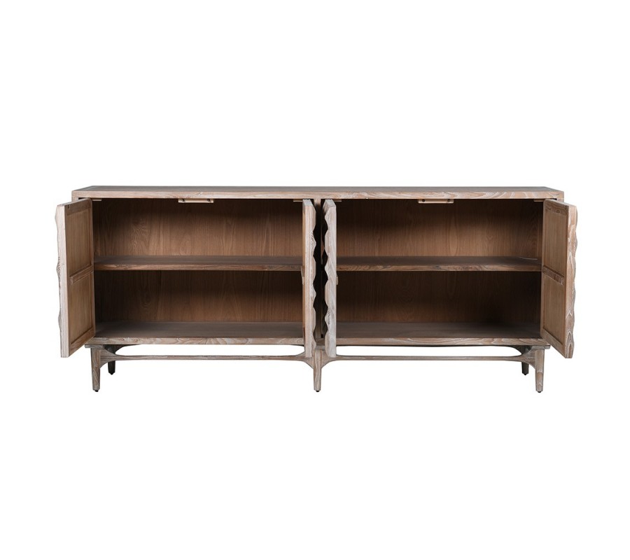 Příborník Cubaro je výjimečný kus nábytku ve stylu art deco, který okamžitě upoutá svým dekorativním vzhledem a luxusním zpracováním. Vyrobený je z masivního jilmového dřeva ve světlém hnědém odstínu, které zvýrazňuje přirozenou kresbu dřeva a dodává povrchu hloubku.
