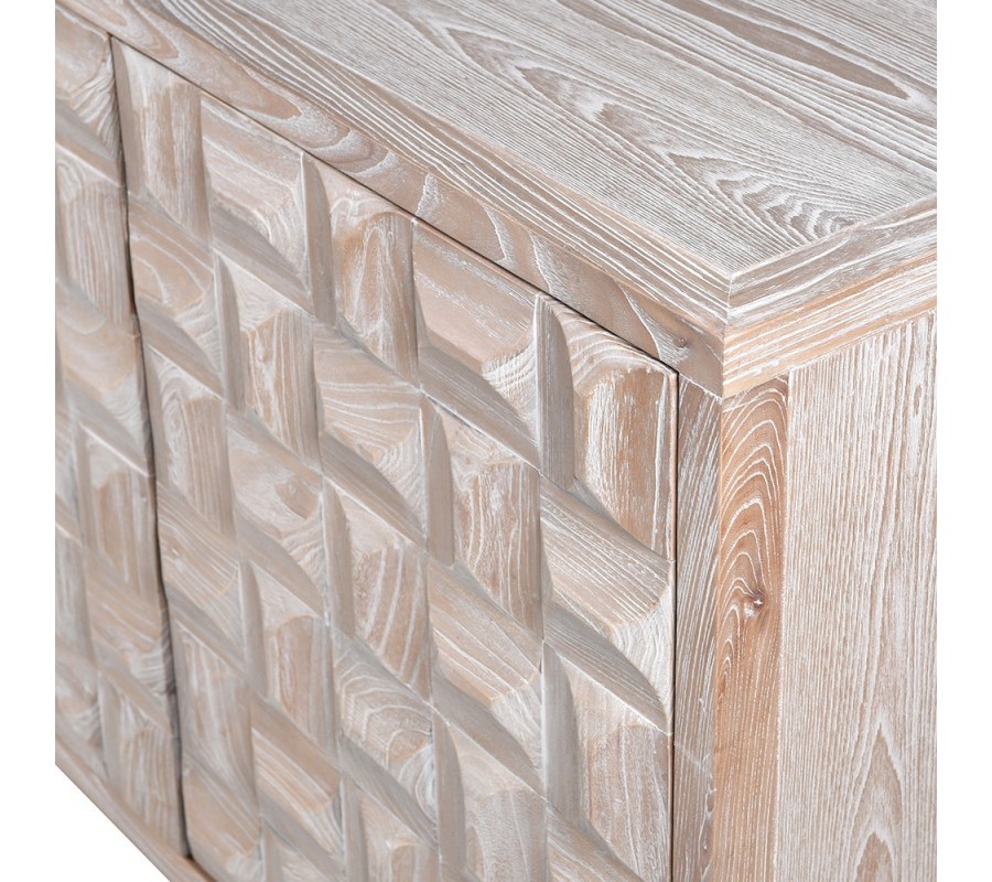 Přední strana příborníku je zdobená plastickým 3D reliéfním vzorem ze čtvercových bloků, které vytvářejí jedinečný optický efekt hry světla a stínu. Tento dekor působí plasticky, umělecky a nadčasově, přičemž je typickým znakem luxusního art deco stylu.