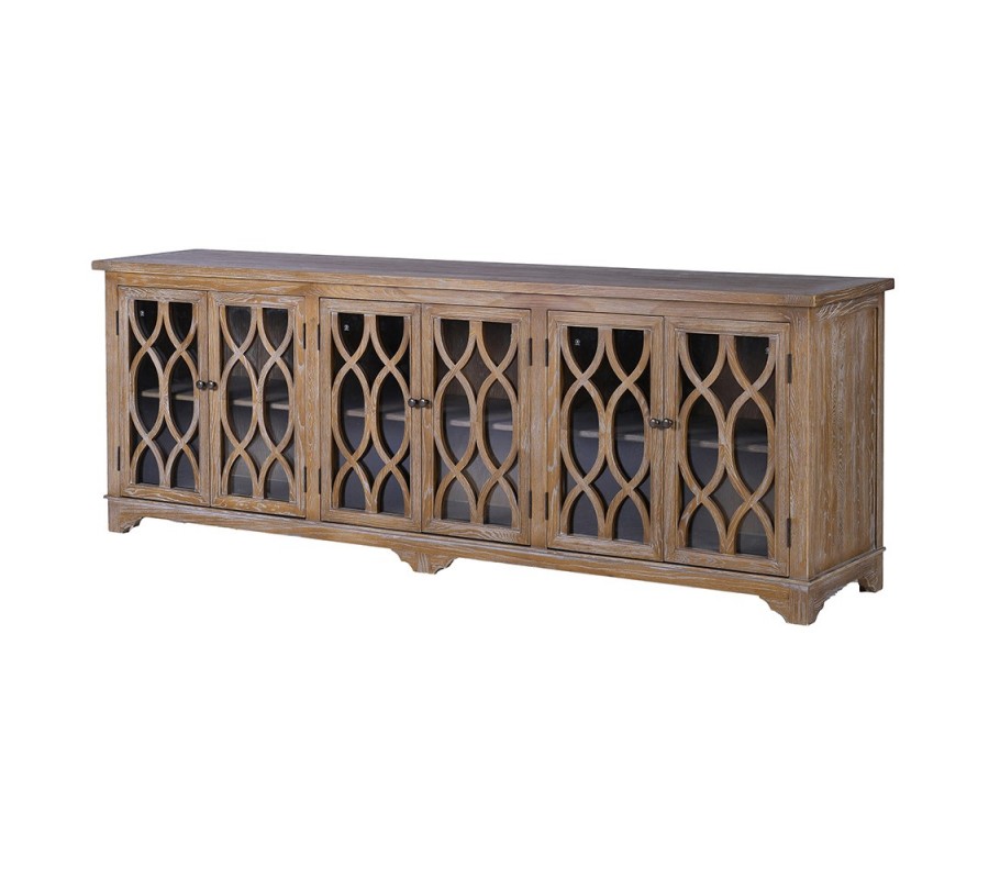 Přední část tvoří šest skleněných dvířek, které jsou zdobeny vyřezávanými dřevěnými ornamenty ve tvaru elegantních vlnek. Kovové mosazné úchyty v kulatém tvaru podtrhují starobylý šarm a doplňují koloniální styl. Uvnitř se nacházejí tři prostorné police, které nabízejí dostatek úložného prostoru pro nádobí, dekorace nebo textilie.
