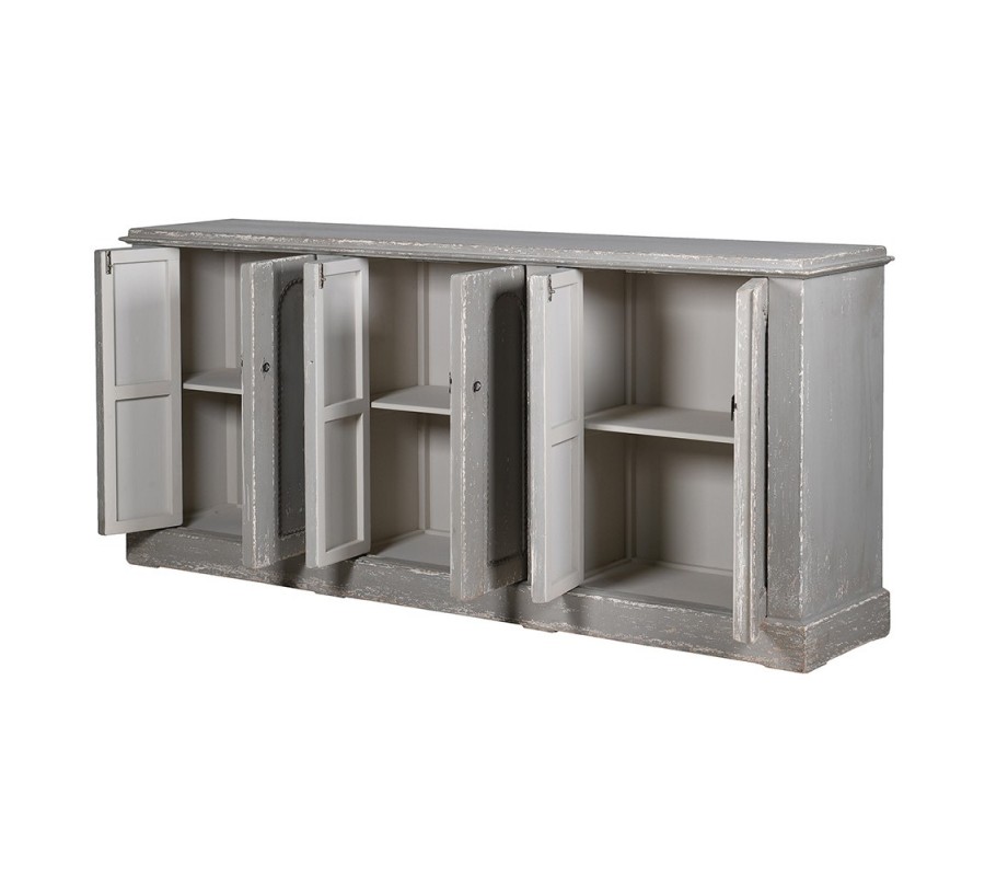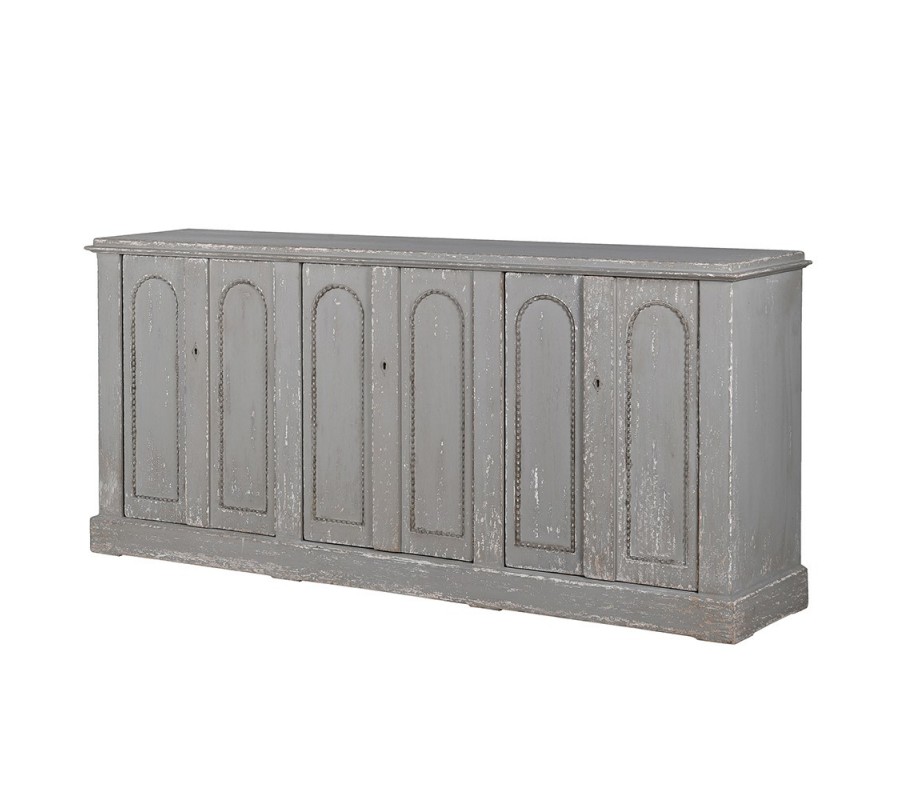 Luxusní vintage příborník Fogley se šesti dvířky s obloukovým zdobením ze světle šedé barvě se zestárlým efektem 216 cm