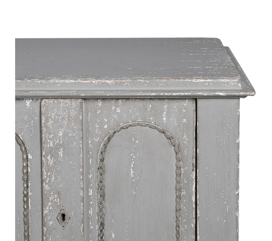 Příborník je vyroben z recyklovaného masivního dřeva, které mu propůjčuje autentický vintage charakter. Šedý nátěr je místy záměrně sešoupaný a působí starožitným dojmem. Interiér úložného prostoru je hladce obroušen s čistým bílým lakováním, což zaručí bezpečné uskladnění předmětů uvnitř.