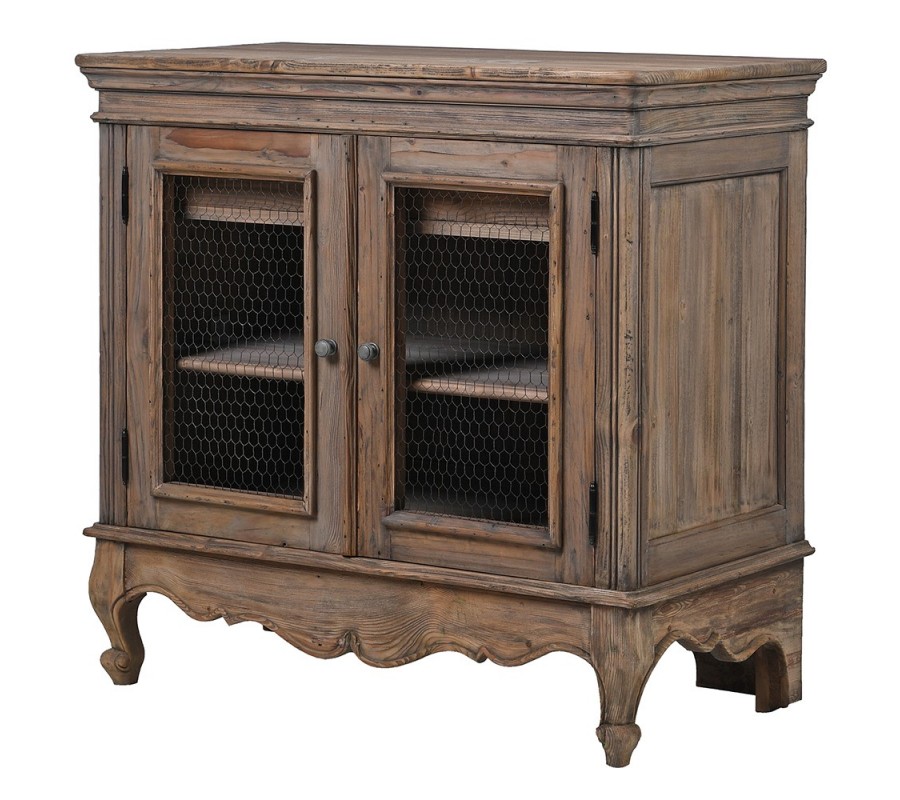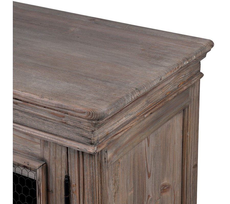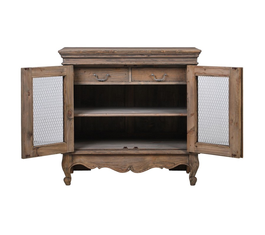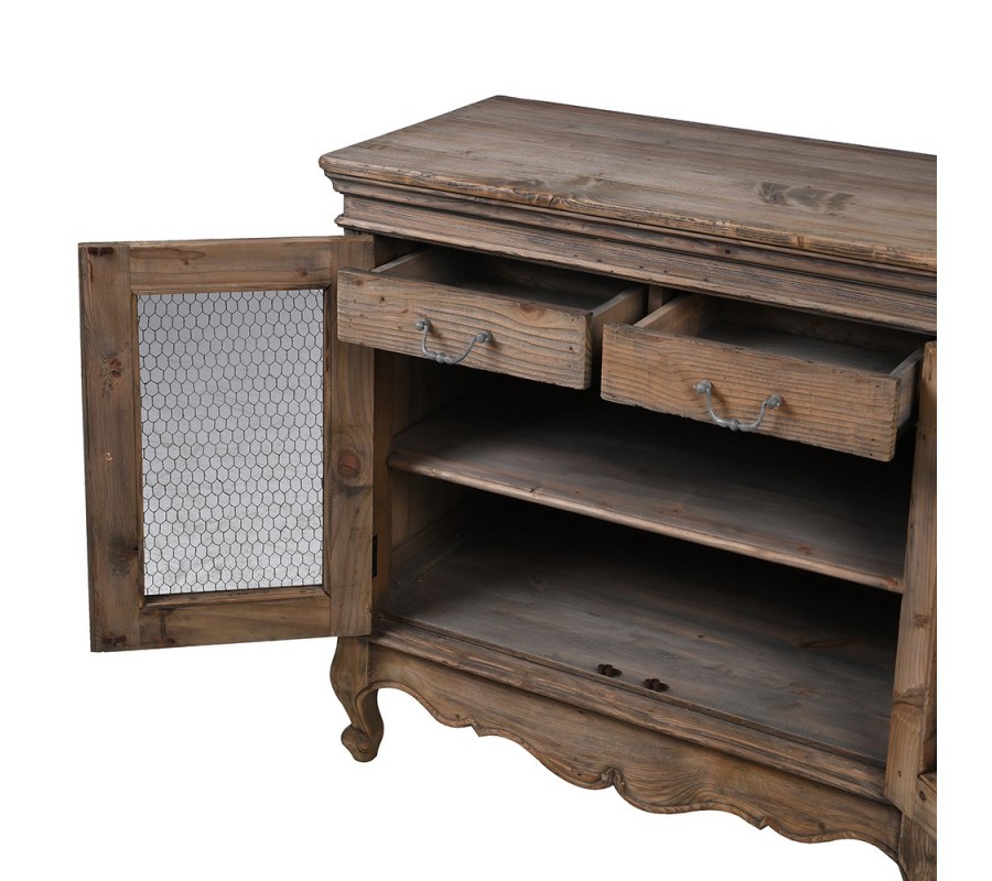 Příborník Selton spojuje tradiční venkovský design se zajímavým detailem v podobě drátěného výpletu dvířek. Bohaté vyřezávané zdobení mu dodává eleganci klasického stylu a tento nábytek tak oceníte nejen pro jeho funkčnost, ale také estetický vzhled.