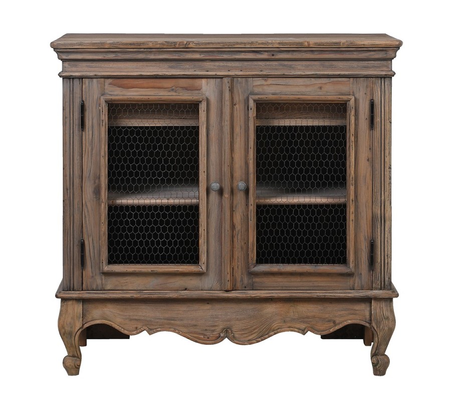 Luxusní venkovský dvoudveřový příborník Selton s vyřezávaným zdobením a kovovým výpletem z hnědého masivního dřeva 96 cm
