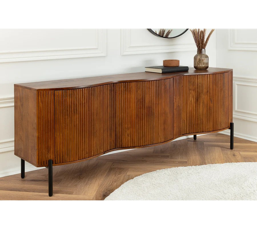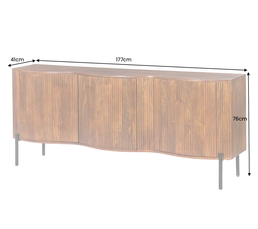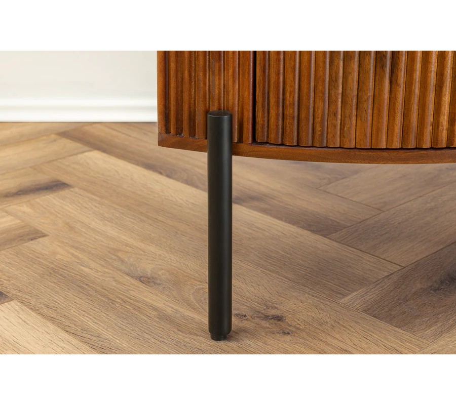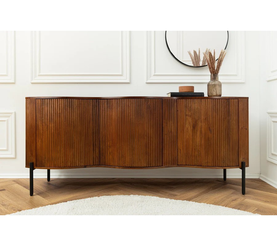 Art deco hnědý třídveřový příborník Allegra z mangového dřeva s dekorativními lamelami s černými kovovými nožičkami 177 cm