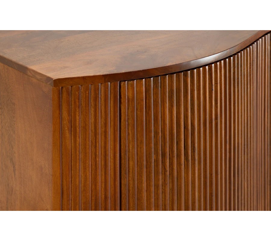 Je vyroben z mangového dřeva v teplém hnědém odstínu se zachovanou přirozenou kresbou, což podtrhuje její přírodní charakter. Přední část je zdobená dekorativními tenkými vertikálními lamelami, které opticky zvýrazňují zvlněný tvar komody a dodávají jí rytmus a jemnou plastičnost.