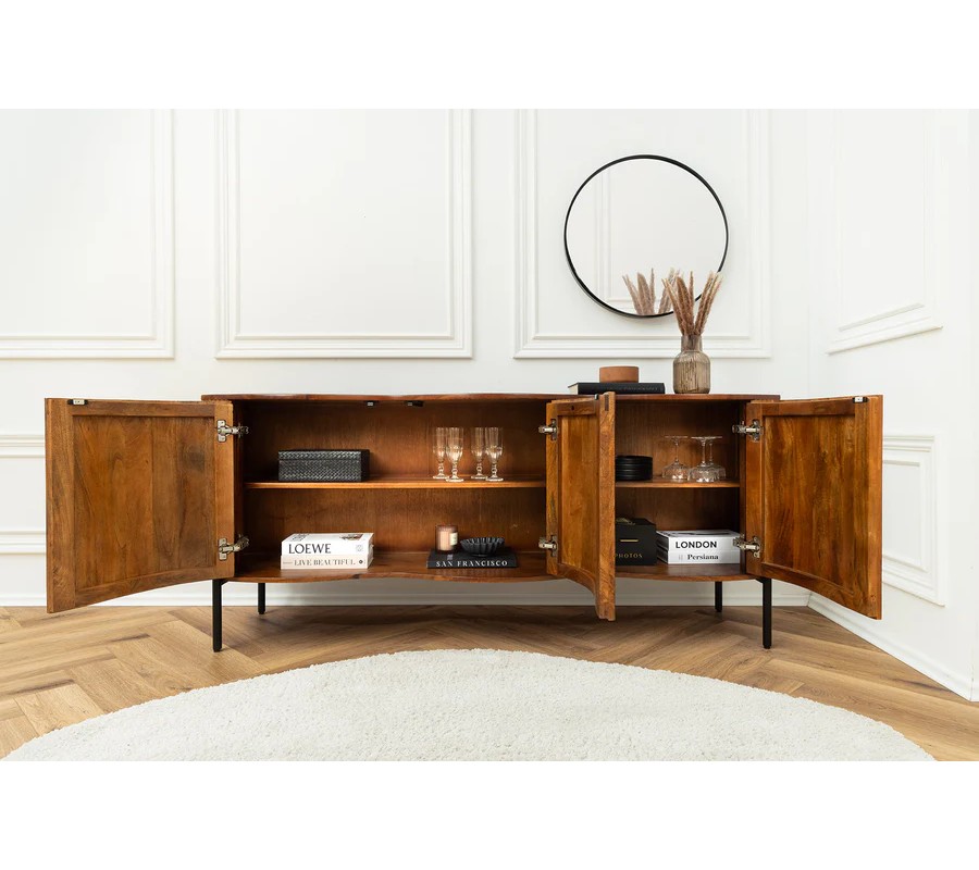 Celá konstrukce stojí na čtyř úzkých kovových nožičkách v černé barvě, které odlehčují vzhled komody a vytvářejí příjemný kontrast k teplému odstínu mangového dřeva. Díky kombinaci přírodního materiálu a zvlněných linií komoda působí stylově a luxusně.