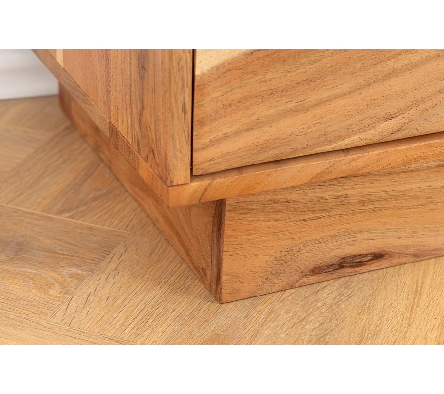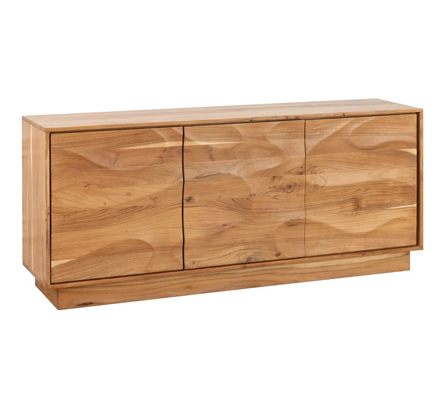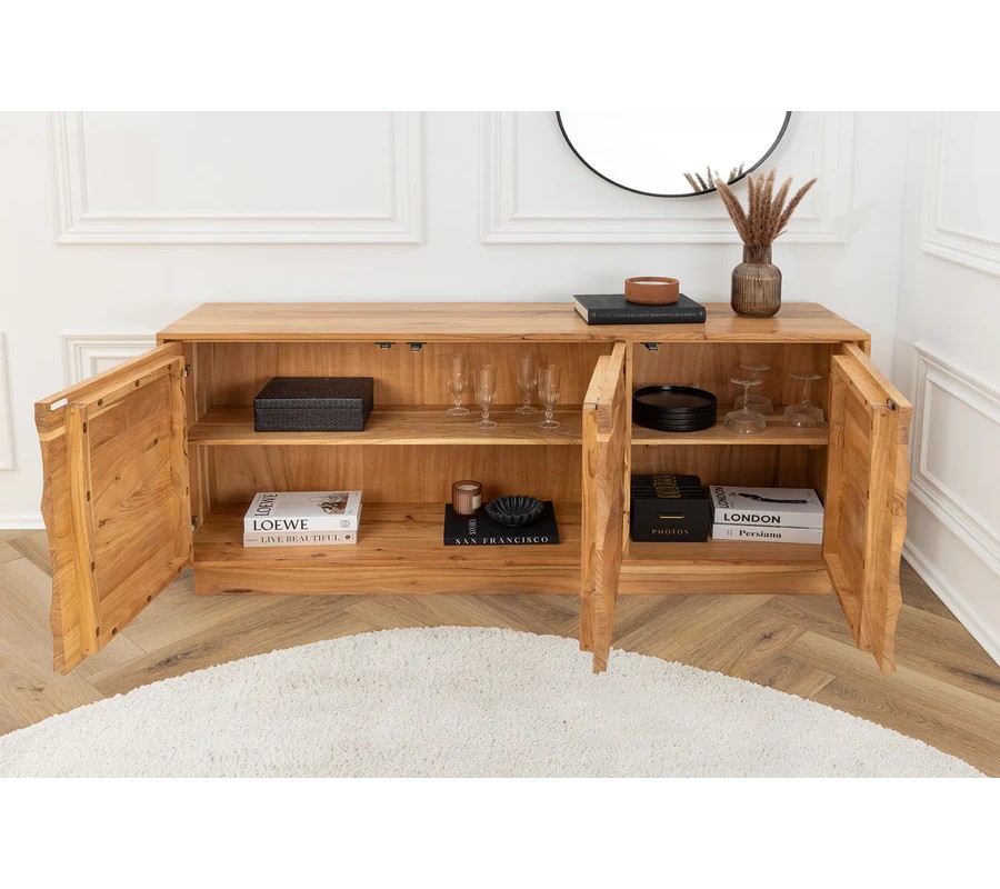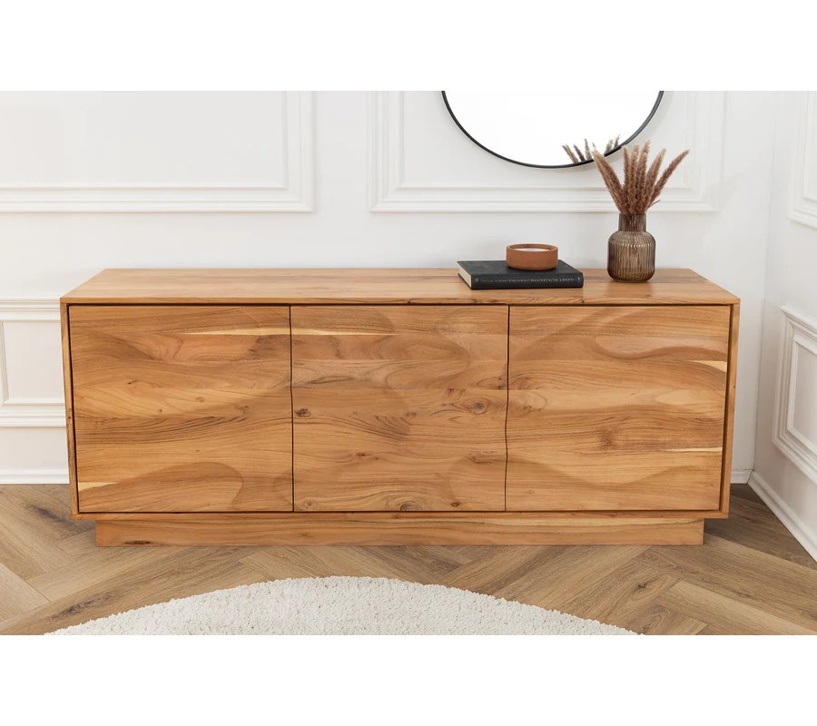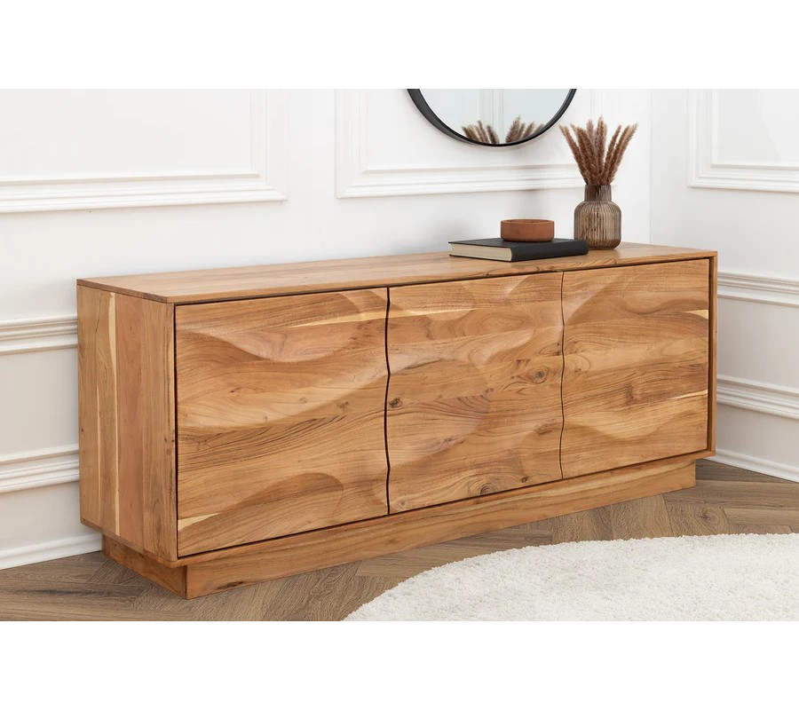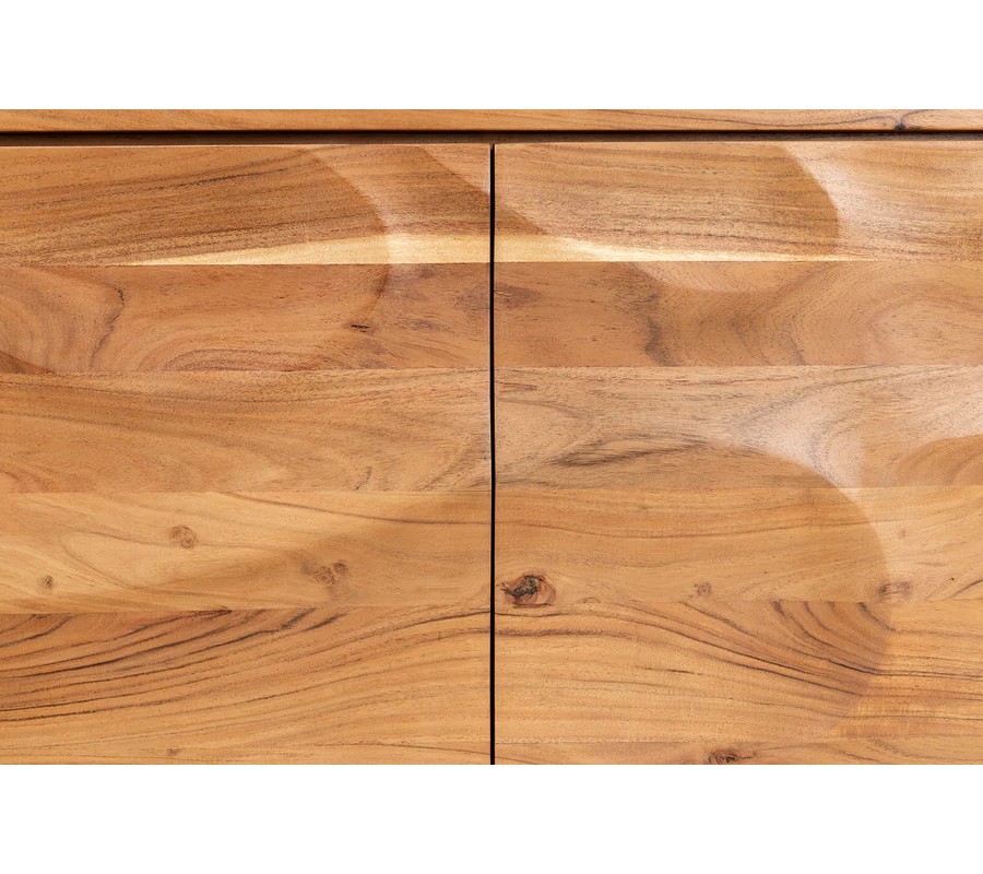 Přední část příborníku je zdobená dekorativním reliéfem tvořeným vystouplými vlnami a kresbou akáciového dřeva, které vytvářejí organický vzor připomínající jemné pohyby hladiny vody. Celá konstrukce stojí na obdélníkové podstavě, která harmonicky dotváří celkový design a zajišťuje maximální stabilitu.