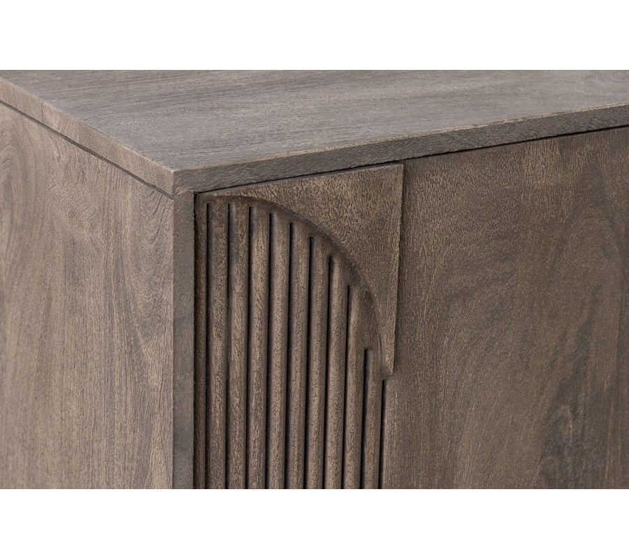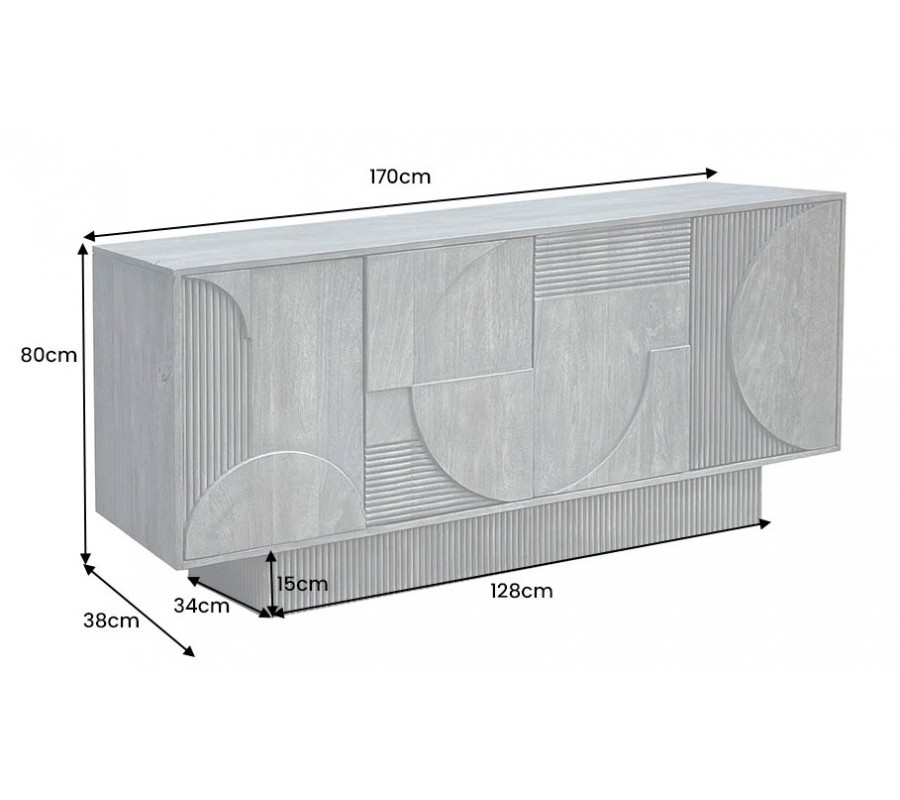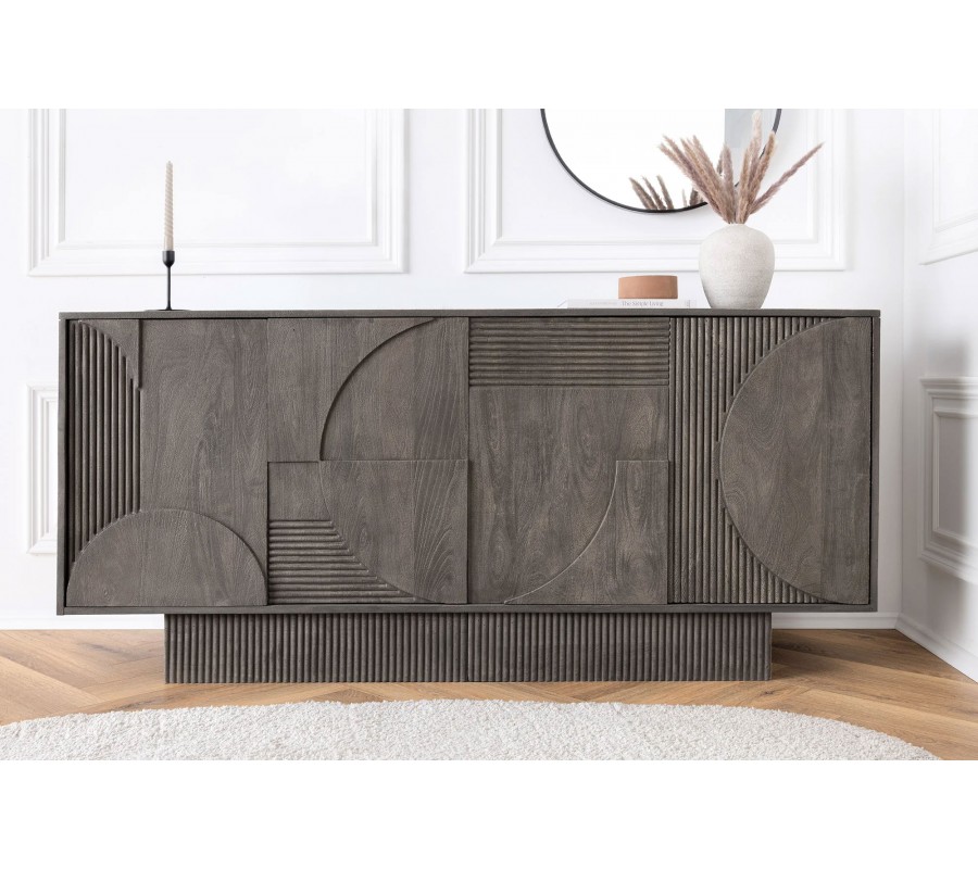 Moderní art deco příborník Sonia se čtyřmi dvířky s geometrickým zdobením z masivního mangového dřeva v šedé barvě 170 cm