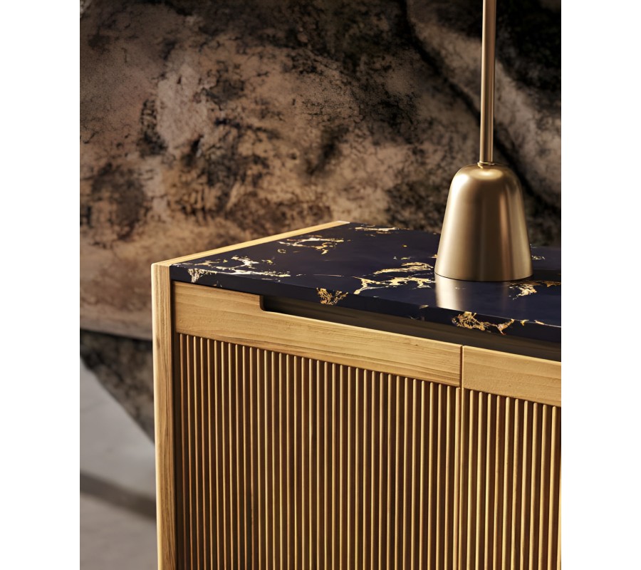 Horní deska příborníku je výrazným prvkem — má mramorový design s černým podkladem a zlatými žilkami, který působí luxusně a elegantně. Povrch je hladký a vizuálně bohatý, přičemž dokonale ladí s teplým tónem dubového dřeva.