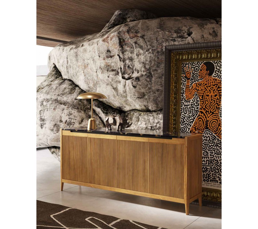 Luxusní moderní obdélníkový příborník Tallin s vroubkovanými dvířky a mramorovou deskou z dubového dřeva 190 cm