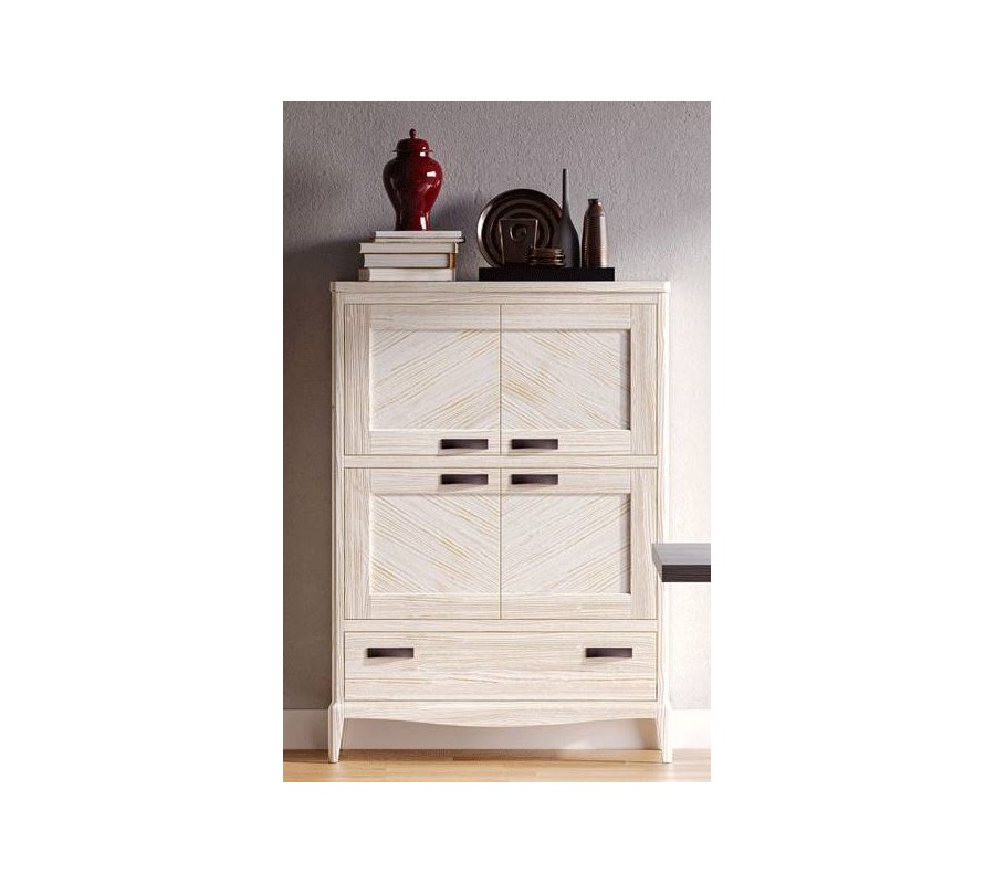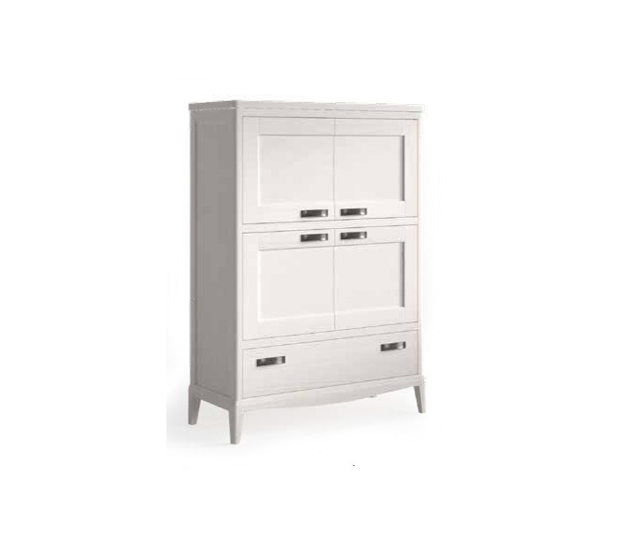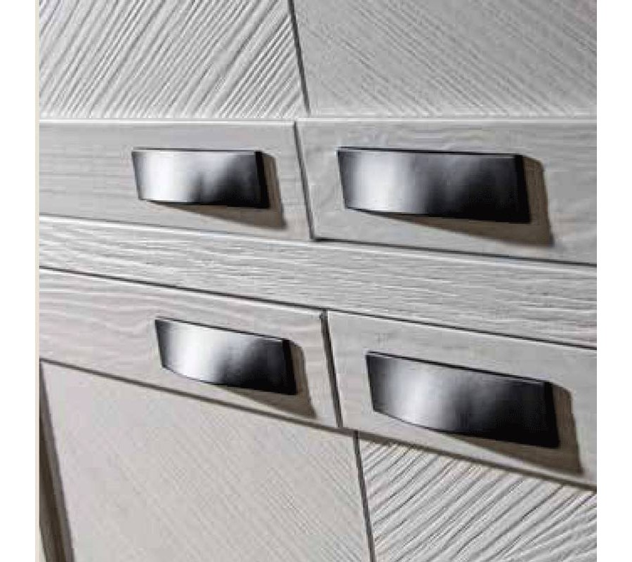 Příborník je členěn vertikálně – sestává ze čtyřdveřového řešení s dvojicemi dvoudveřových skříněk umístěných nad sebou, což vytváří přehledné a praktické uspořádání úložného prostoru. Ve středové části se nacházejí kovové úchyty, které se opakují i na velké spodní zásuvce a vytvářejí jednotný vizuální rytmus.
