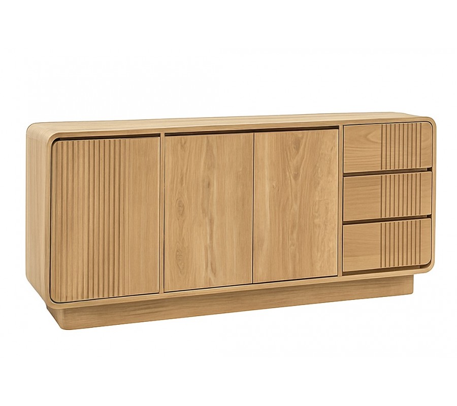 Příborník má obdélníkový tvar s výrazně zaoblenými hranami. Jeho silueta je inspirována retro designem tzv. waterfall nábytku, který byl mimořádně populární zejména ve 20. letech minulého století. Úložný prostor sestává z jedné dvoudveřové skříňky ve středu, kterou na pravé straně doplňují tři zásuvky umístěné nad sebou. Na levé straně se nachází jednodvéřová skříňka. Ve spodní části zaručí stabilitu plná obdélníková podstava se zaoblenými rohy, která díky menšímu průměru design vizuálně odlehčuje.