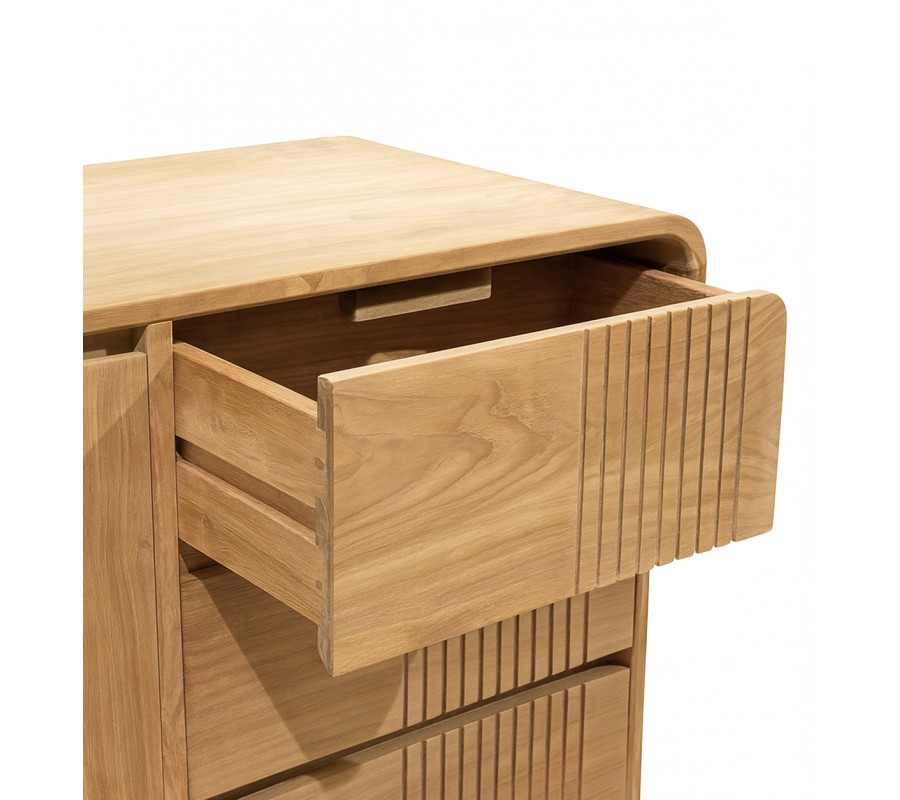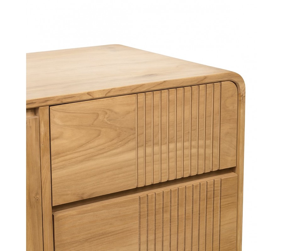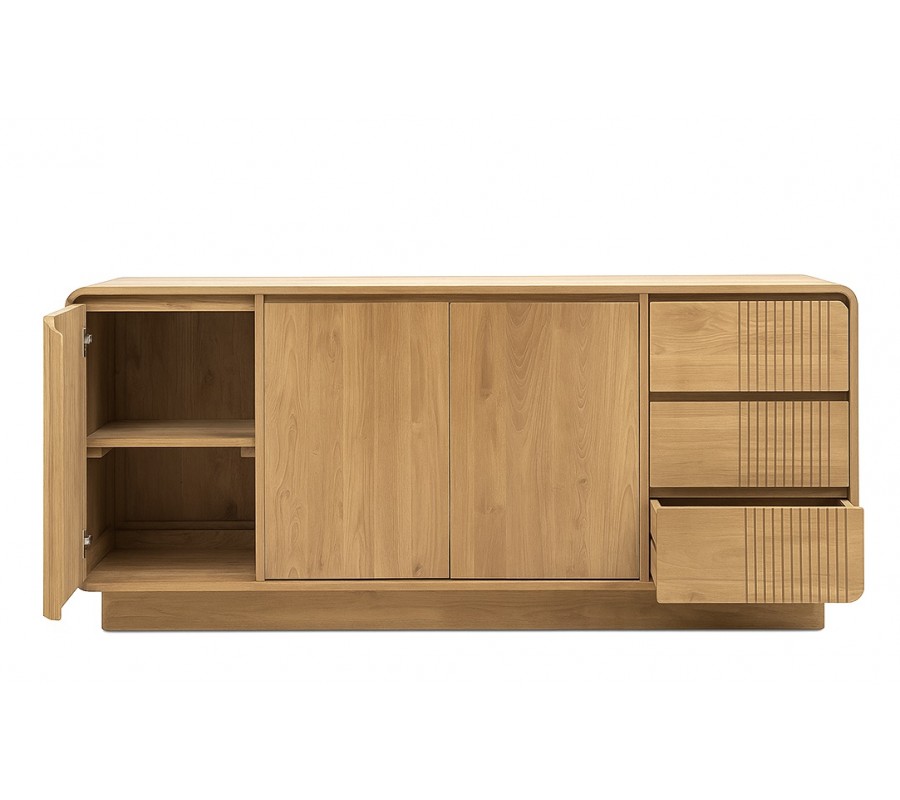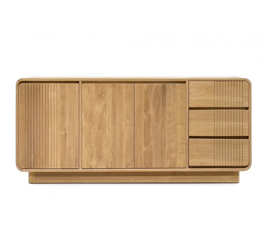 Skříňky jsou uvnitř předěleny policí, která optimalizuje úložný prostor a poskytuje tak dostatečně velký prostor i na větší nádobí či úložné boxy. Příborník je vyroben z teakového dřeva v naturální světle hnědé barvě s jemnou kresbou letokruhů. Tento materiál je velmi oblíbený díky své vysoké pevnosti a odolnosti. Zároveň dodává nábytku luxusní charakter.
