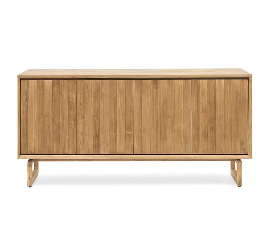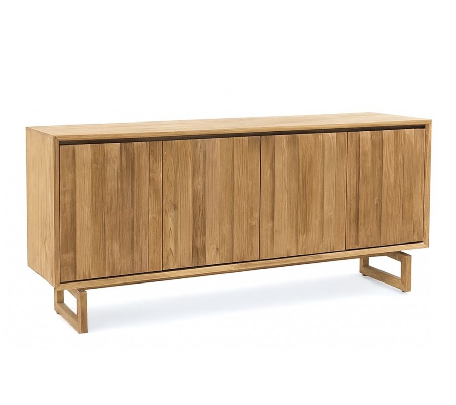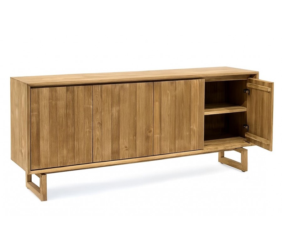 Luxusní masivní příborník Paschal z teakového dřeva ve světle hnědé barvě se čtyřmi dvířky a designovýma nohama 180 cm