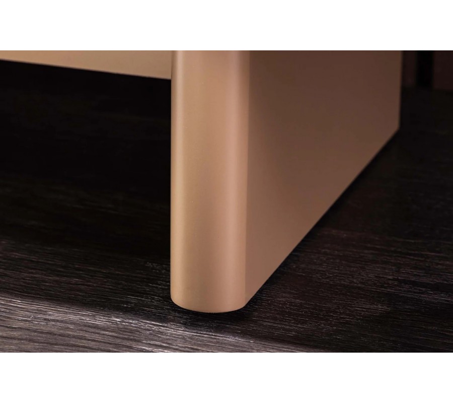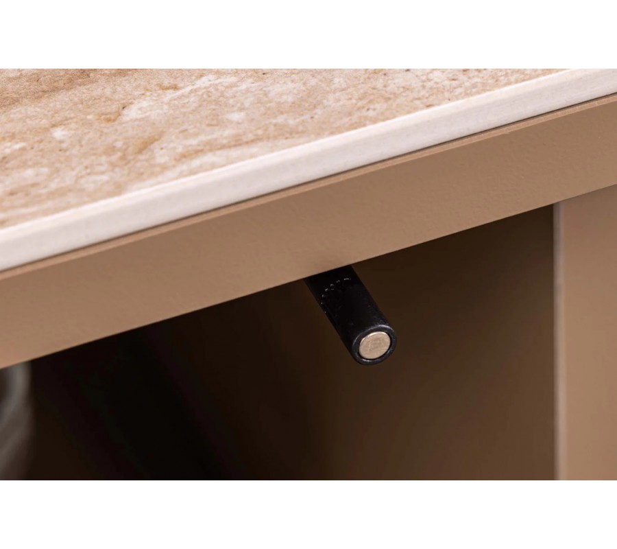 Vrchní deska je vyhotovena z keramiky s mramorovým travertinovým designem v hnědé barevnosti, který působí přirozeně, teplo a sofistikovaně. Keramický povrch je nejen estetický, ale také odolný a vhodný pro každodenní používání. Příborník stojí na dvou plochých nožičkách, které jsou mezi sebou propojeny spojovací deskou, což zajišťuje stabilitu a zároveň podtrhuje jeho architektonický charakter.