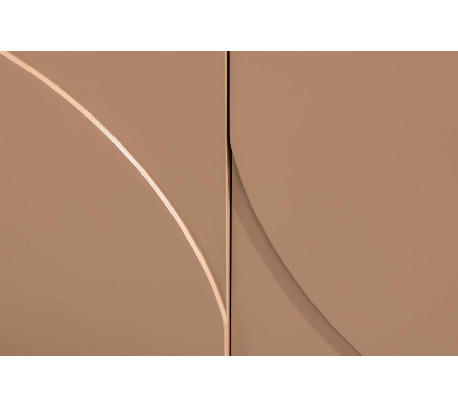Art deco geometrický příborník Savonia v hnědém provedení je elegantním a výrazným kusem nábytku, který v sobě spojuje nadčasový design, funkčnost a luxusní materiály. Obdélníkové tělo příborníku má čtyři dvířka rozdělená do tří skříněk – boční skříňky mají po< policí, zatímco středová skříňka má dvoje dvířka a vnitřní prostor je prakticky členěn vertikální deskou na dvě části, z nichž každá obsahuje vlastní polici. Dvířka jsou zdobena jemným 3D vlnkovým reliéfem, který vystupuje do prostoru a zároveň slouží jako integrované úchyty, čímž se zachovává čistý a uhlazený vzhled bez rušivých prvků.