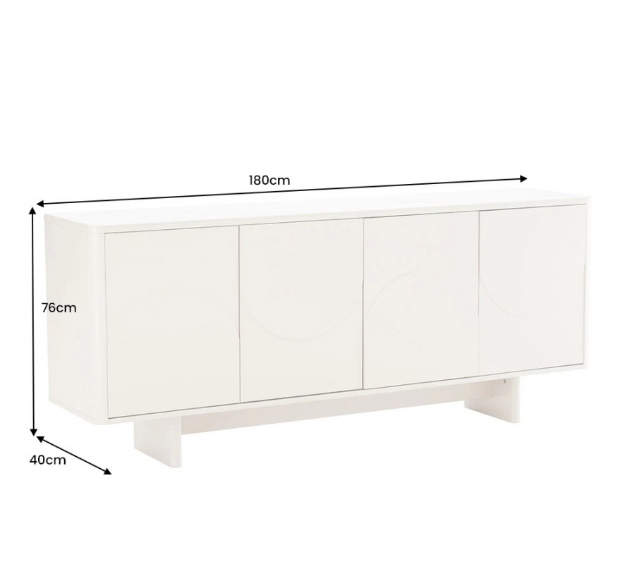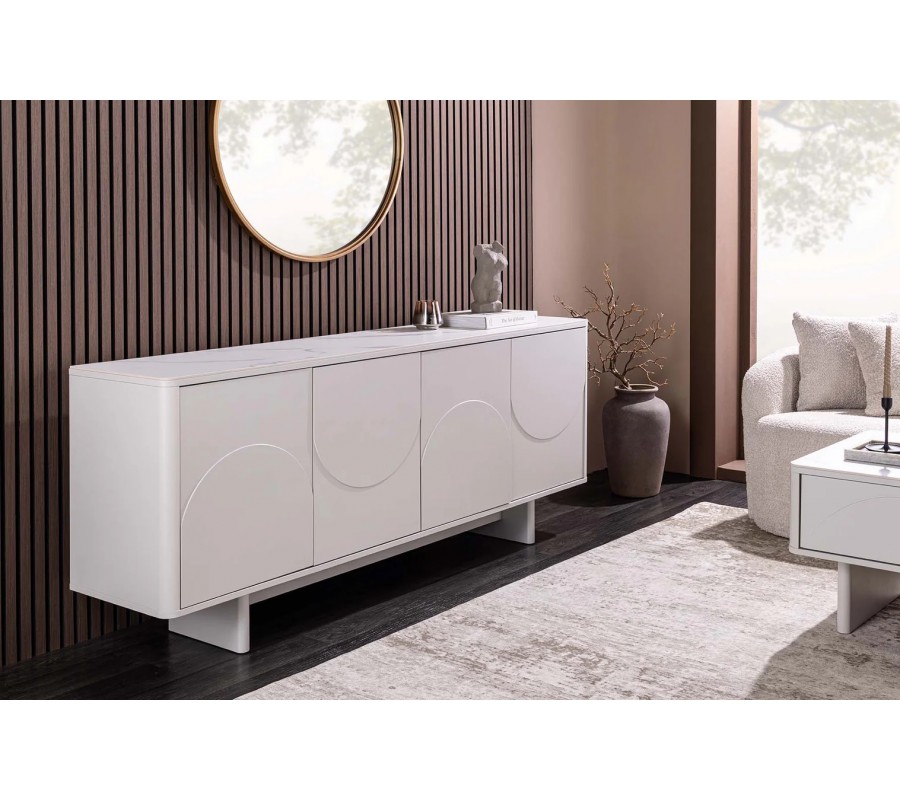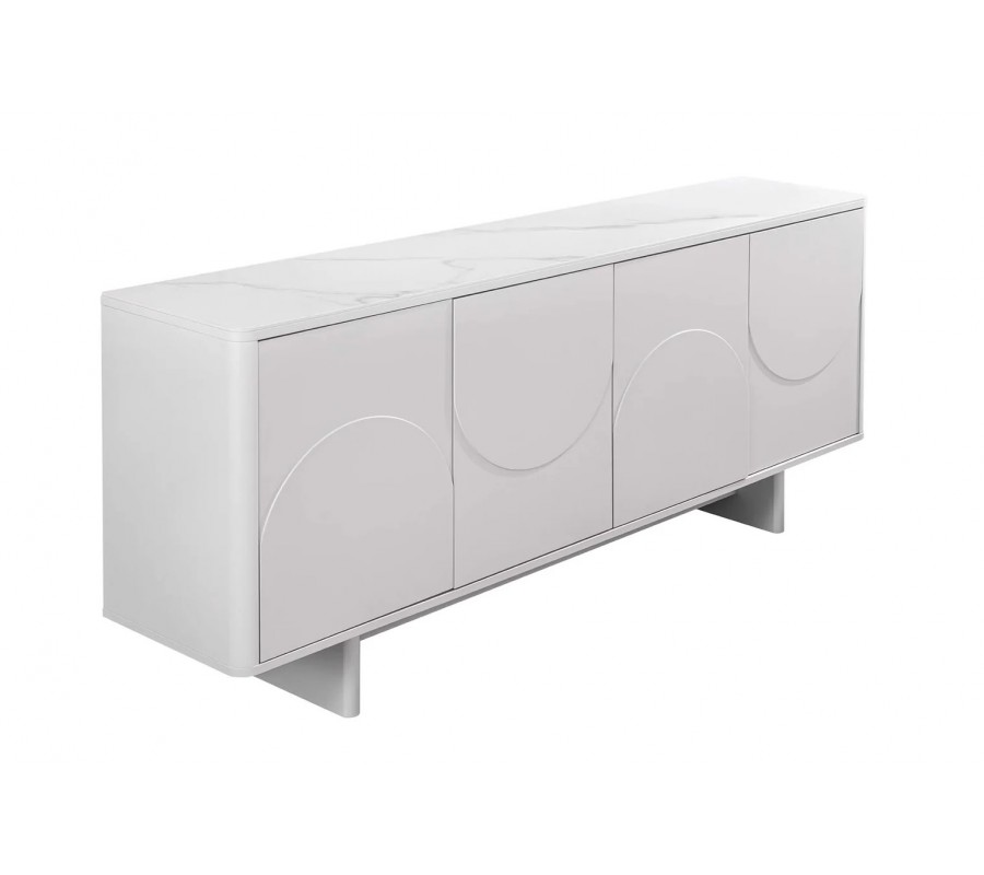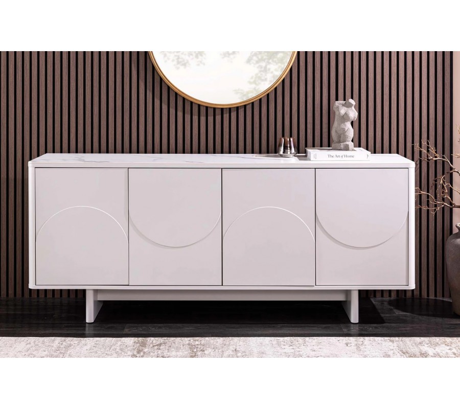Art deco obdélníkový čtyřdveřový bílý příborník Savonia s 3D reliéfem a mramorovou bílou deskou 180 cm