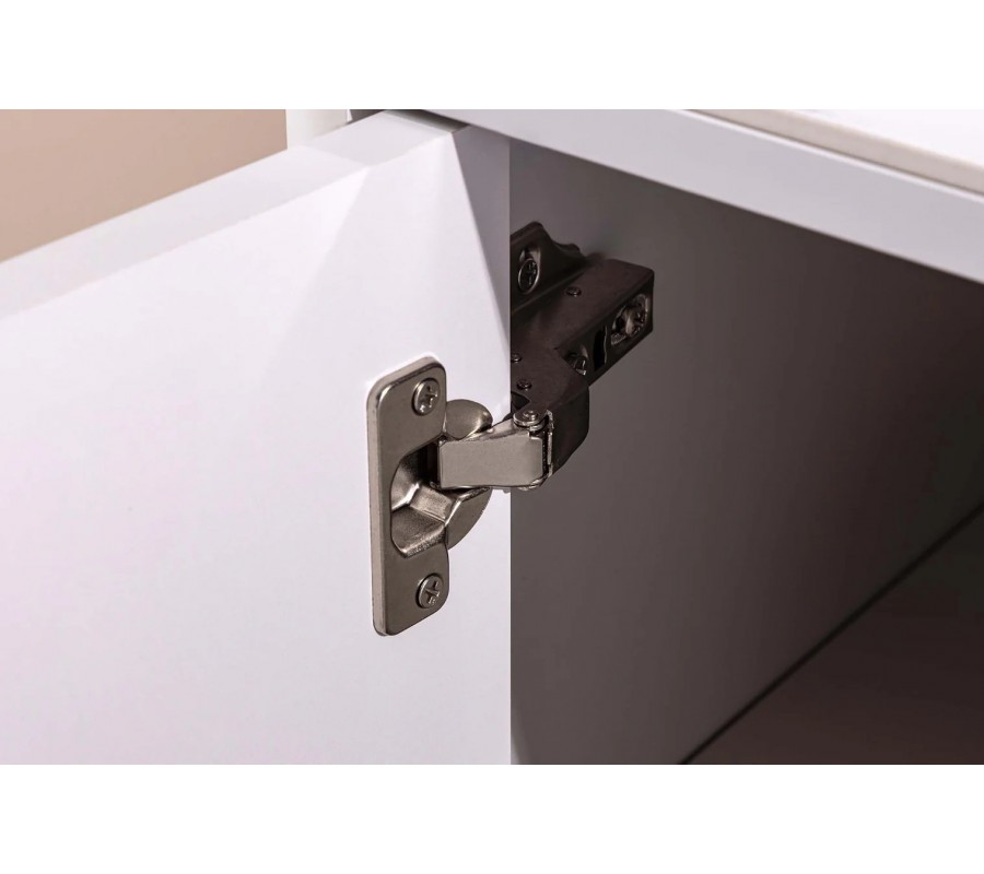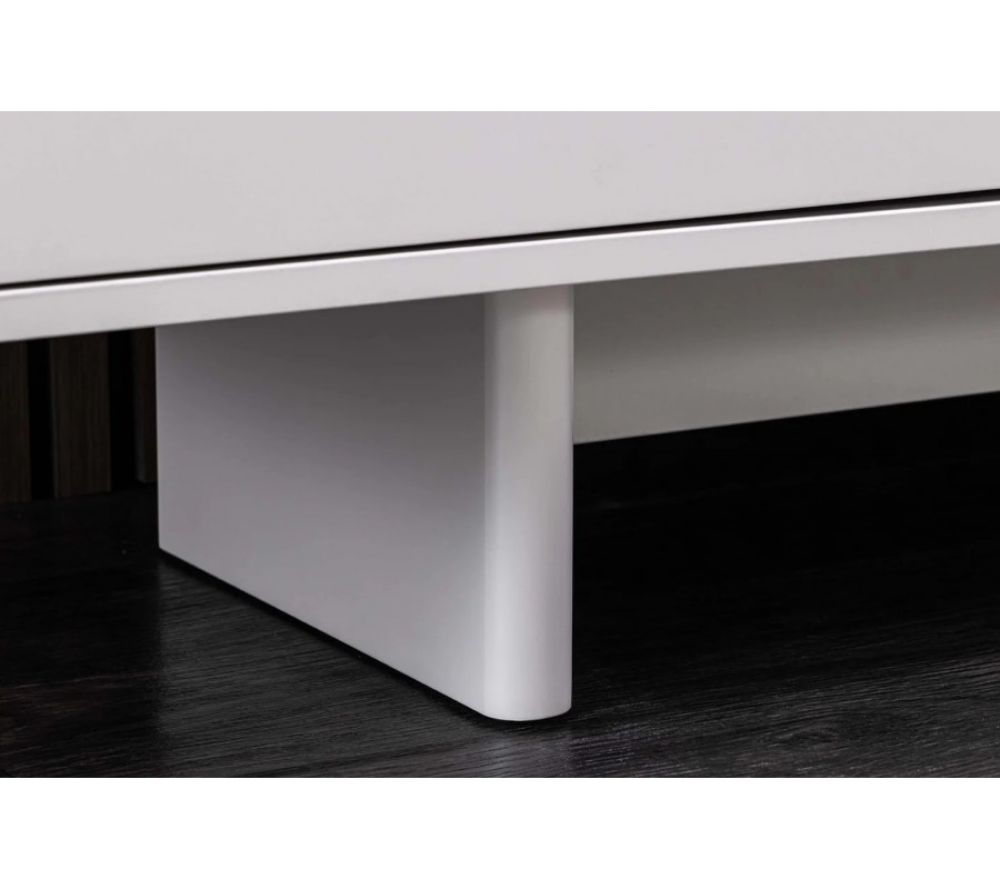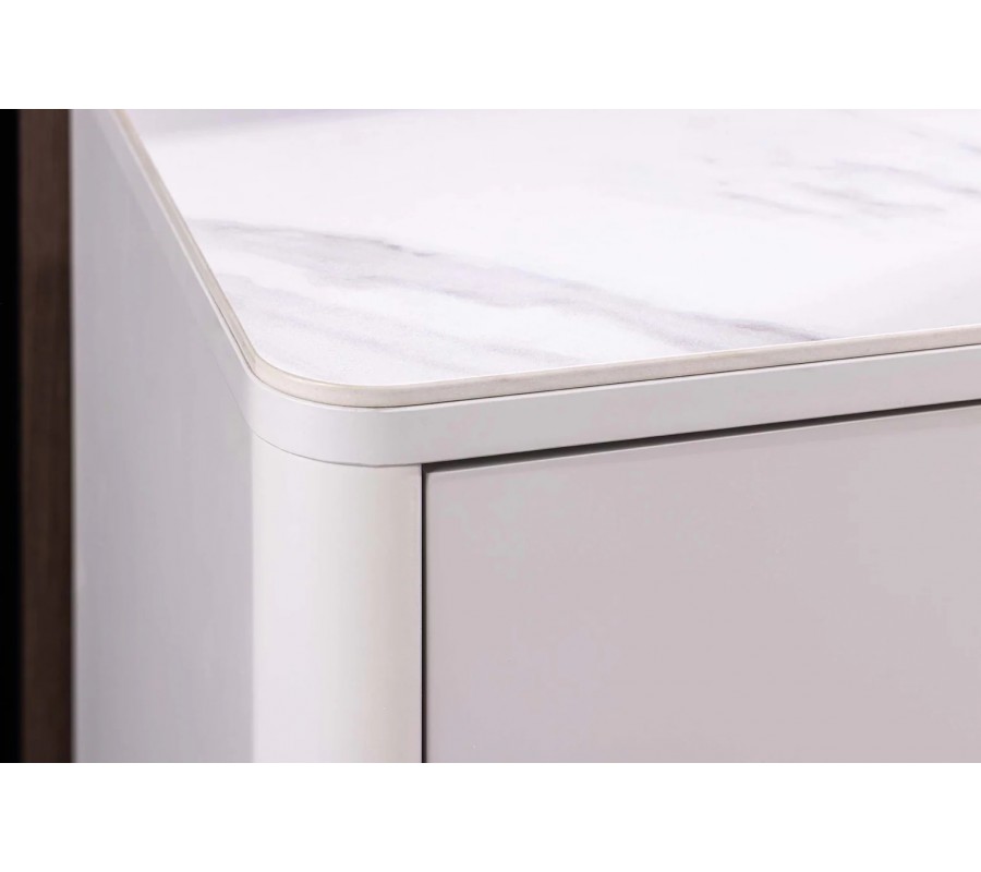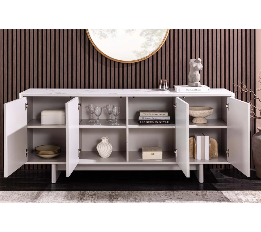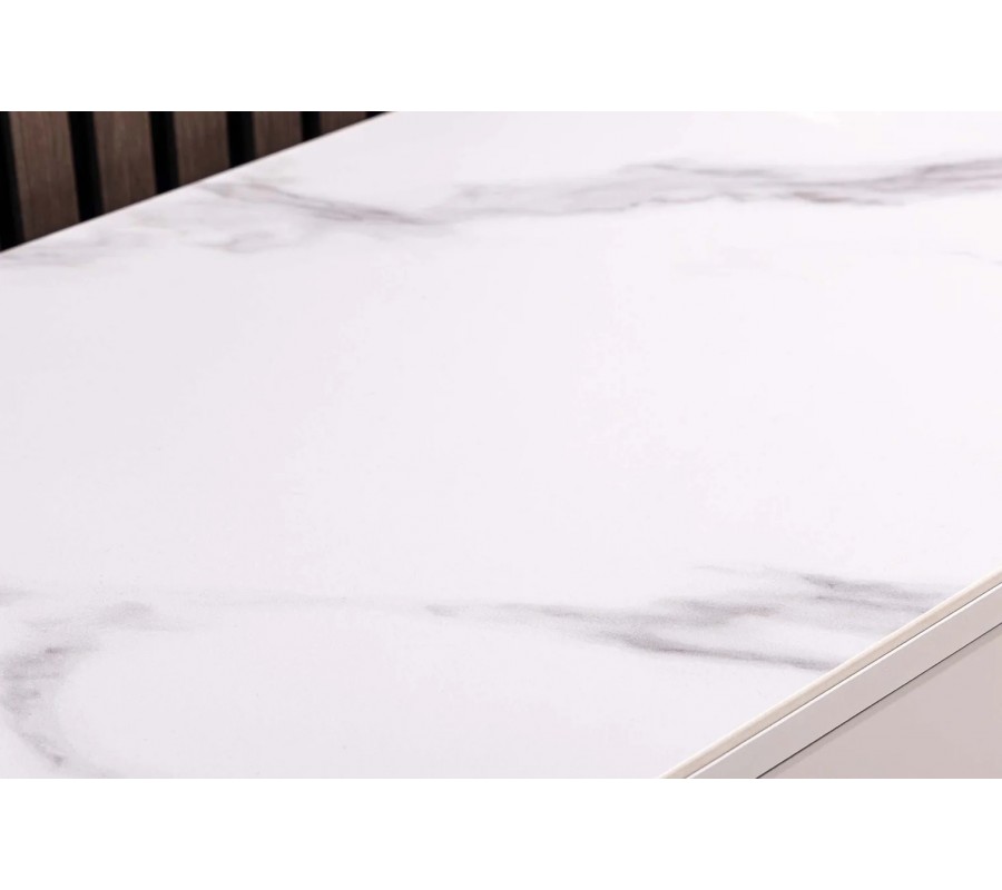 Vrchní deska je vyhotovena z keramiky s mramorovým designem v bílé barvě s šedými žilkami, která působí luxusně, je odolná a zároveň praktická pro každodenní používání. Příborník stojí na dvou plochých nožičkách, které jsou mezi sebou propojeny spojovací deskou, což zajišťuje stabilitu a vizuální vyváženost celku.