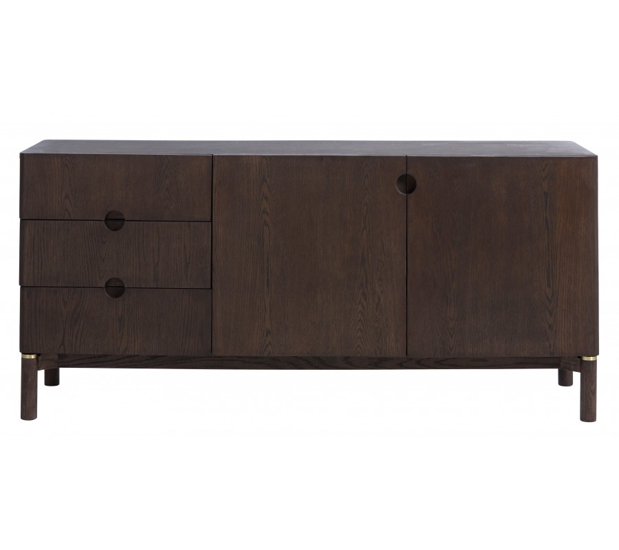 Moderní art deco dvoudveřový příborník Linia se třemi zásuvkami s kulatými úchyty v tmavém hnědém dubovém provedení 160 cm