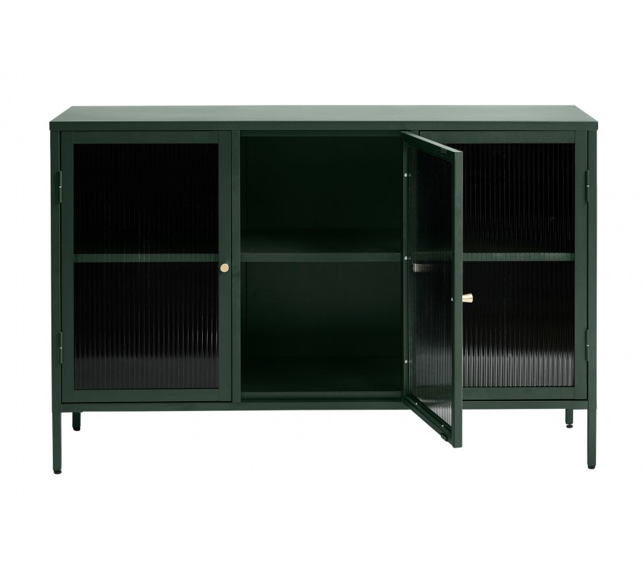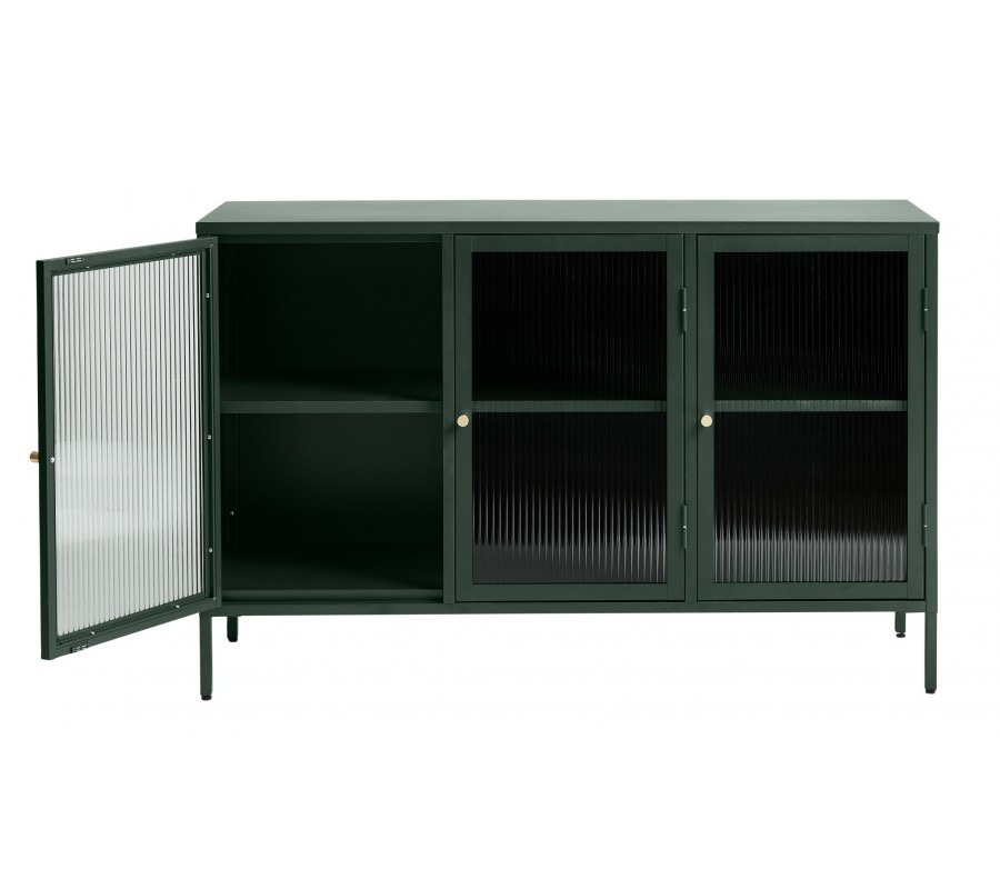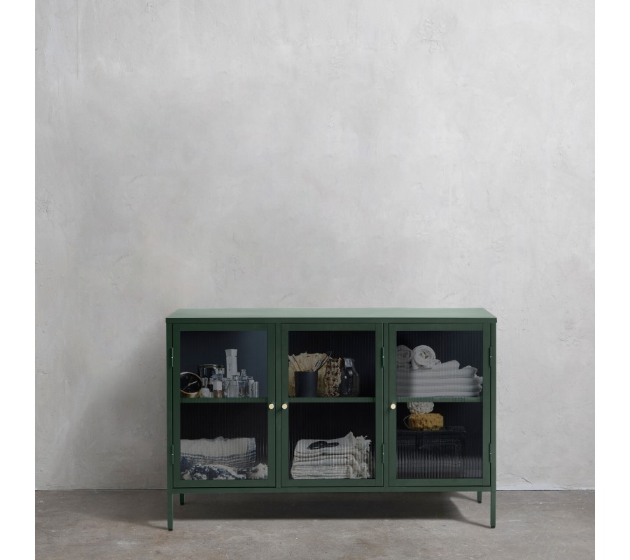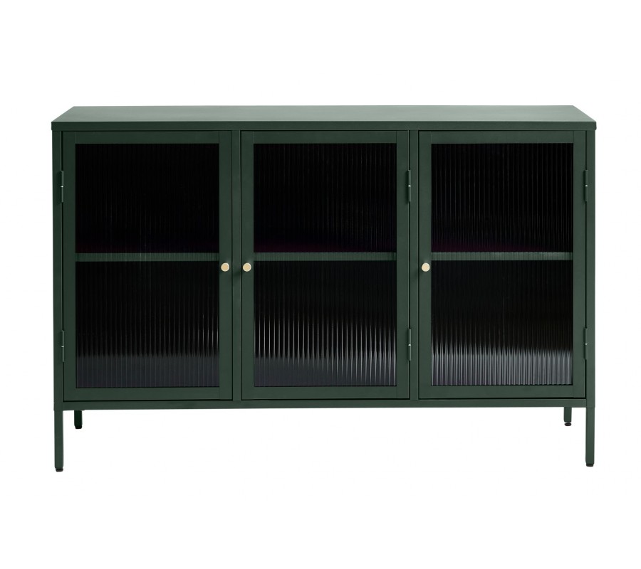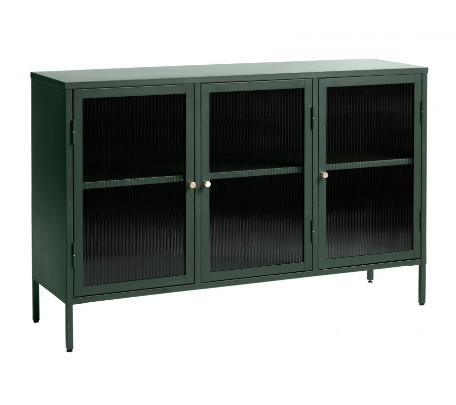Moderní industriální příborník Farver z kovu v zelené barvě se třemi skleněnými dvířky s vroubkovanou strukturou 132 cm