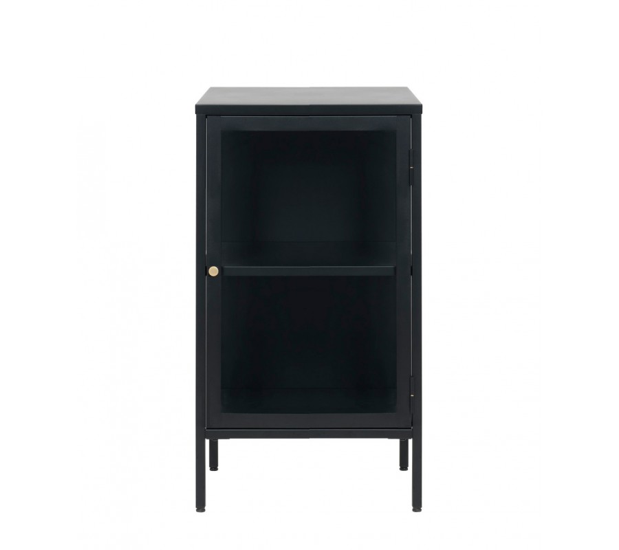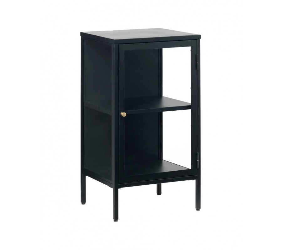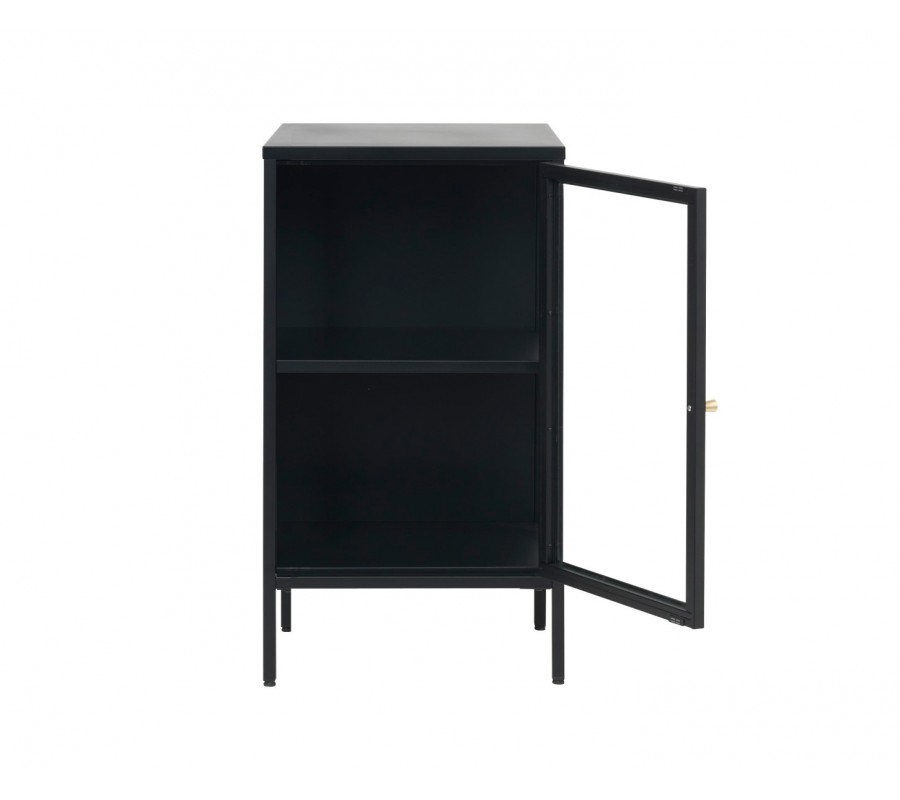 Moderní industriální jednodveřový příborník Soeren z černého kovu s prosklenými dvířky a lesklým zlatým úchytem 45 cm
