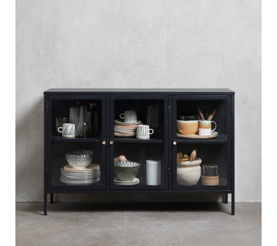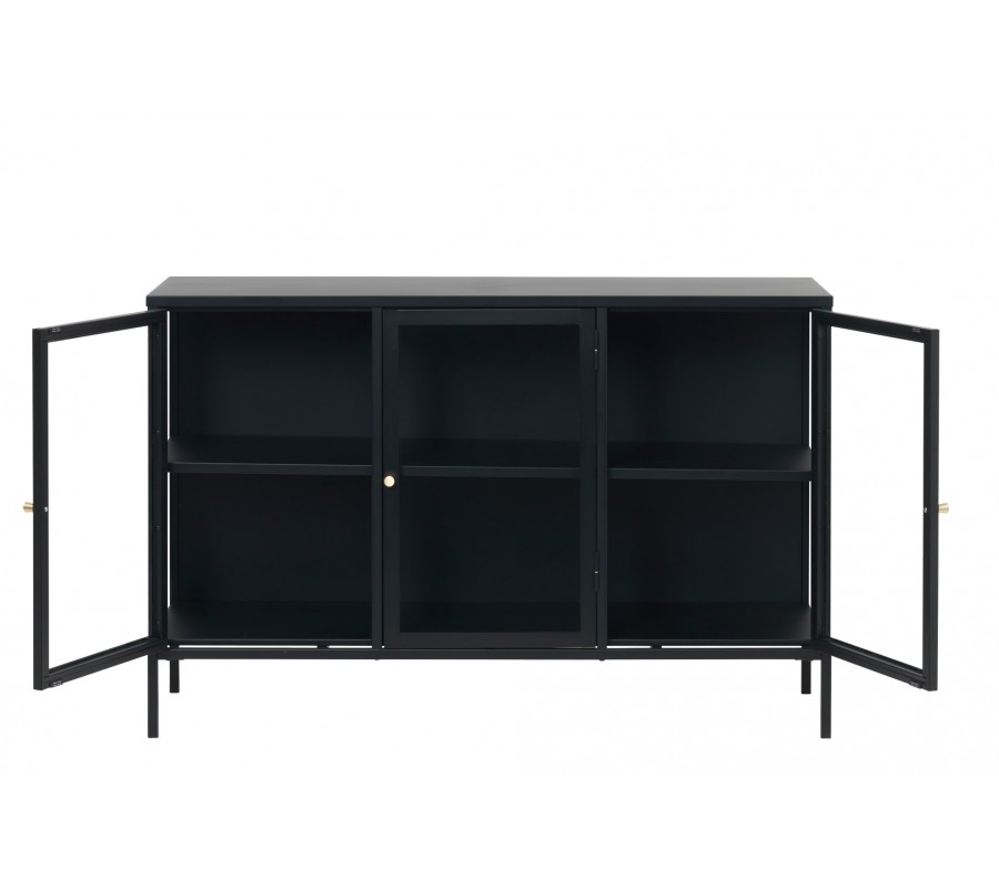Moderní černý třídveřový příborník Soeren z kovovou konstrukcí a průhlednými skleněnými dvířky 132 cm