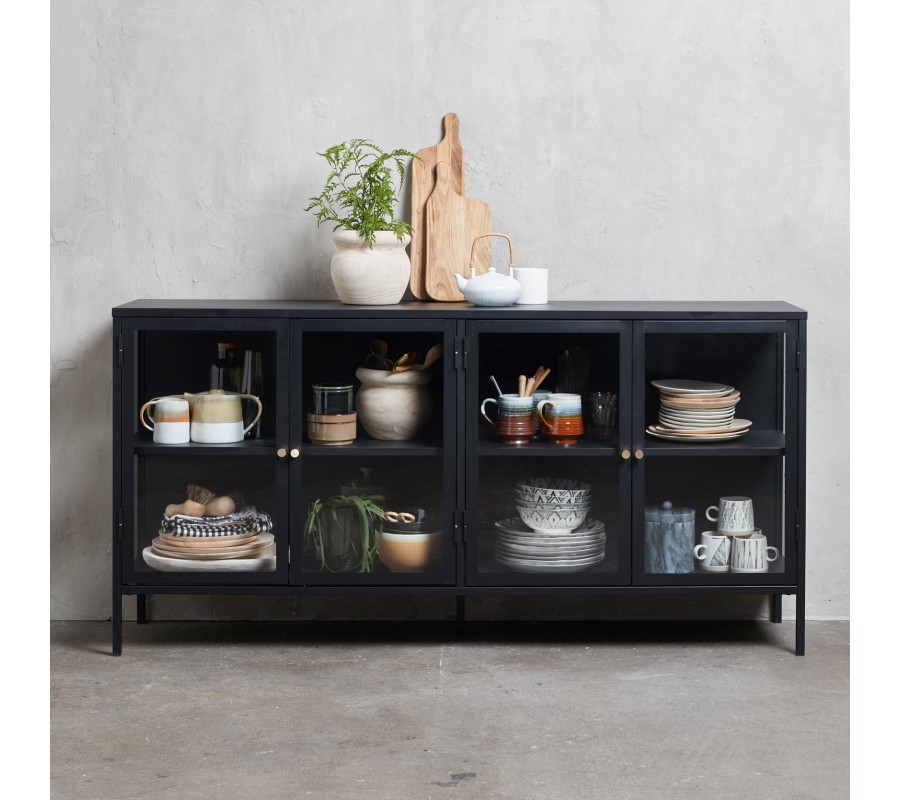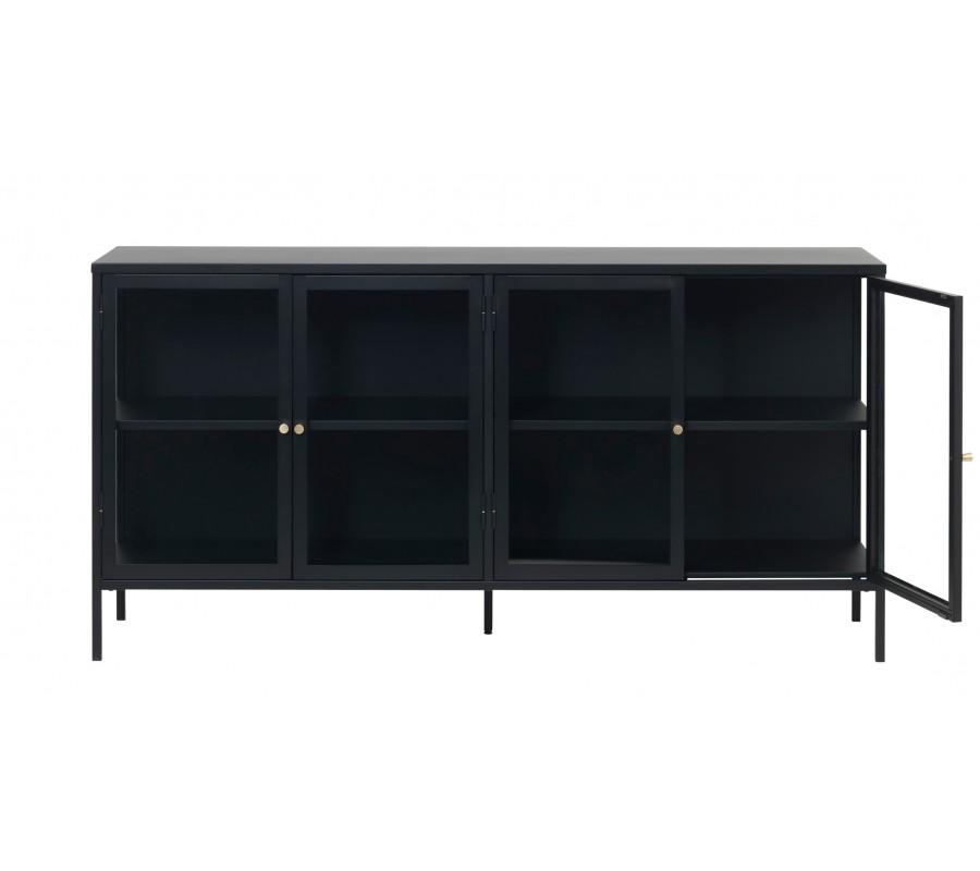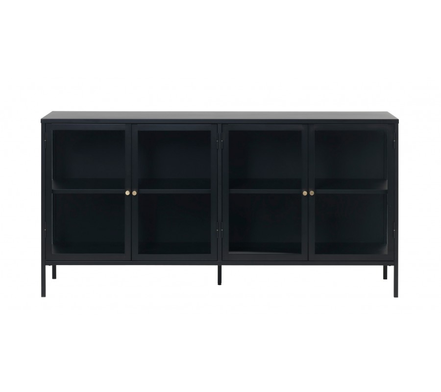 Příborník je vyroben z kovu v matném černém provedení a doplňují jej lesklé zlaté úchyty a detaily na pantech dvířek, které přinášejí do designu eleganci. Výplně z bezpečnostního skla jsou pevné a v kombinaci se štíhlými minimalistickými liniemi odlehčují celkový vizuál nábytku.