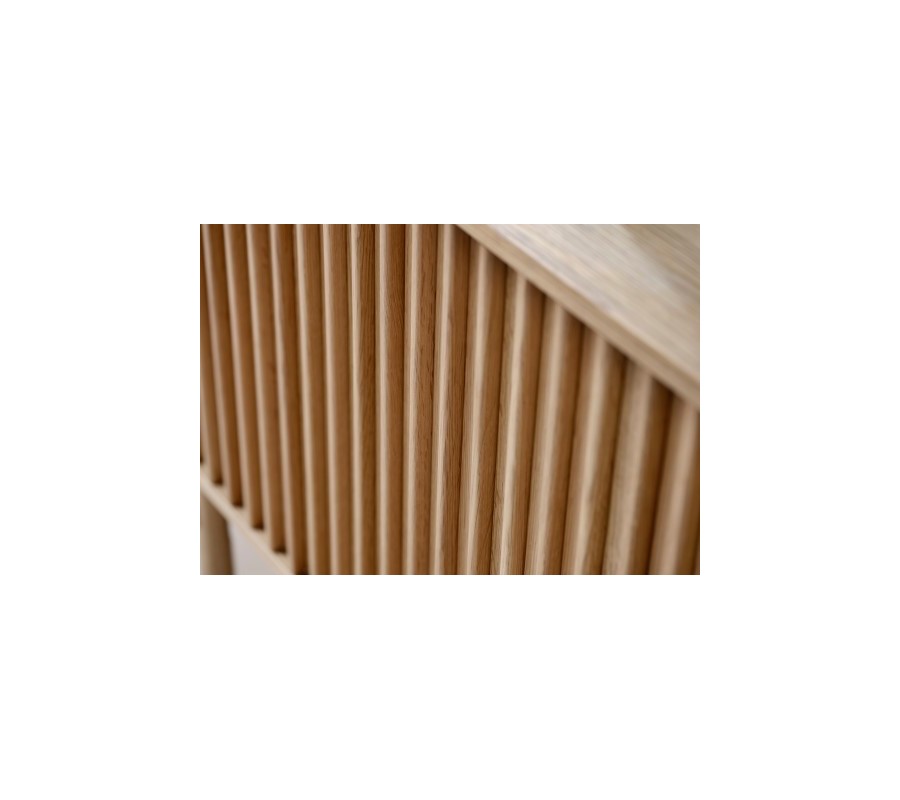 Ve tvaru příborníku dominují čisté linie a geometrie. Vrchní deska je hladká a má dlouhý oválný tvar. Pod ní je umístěn úložný prostor s posuvnými dvířky, které zdobí pravidelně rozmístěné, zaoblené vertikální lamely. Dvířka bez úchytek jsou téměř neviditelně integrována do designu, který tak působí elegantně a minimalisticky.