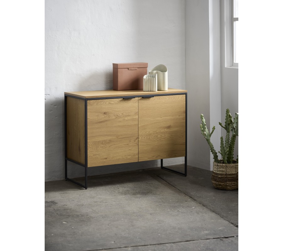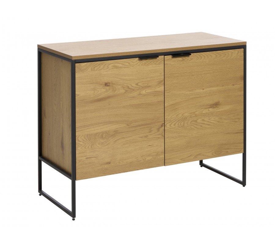 Designový industriální dvoudveřový příborník Holstebro ve světlém hnědém dubovém provedení s černým kovovým rámem 105 cm