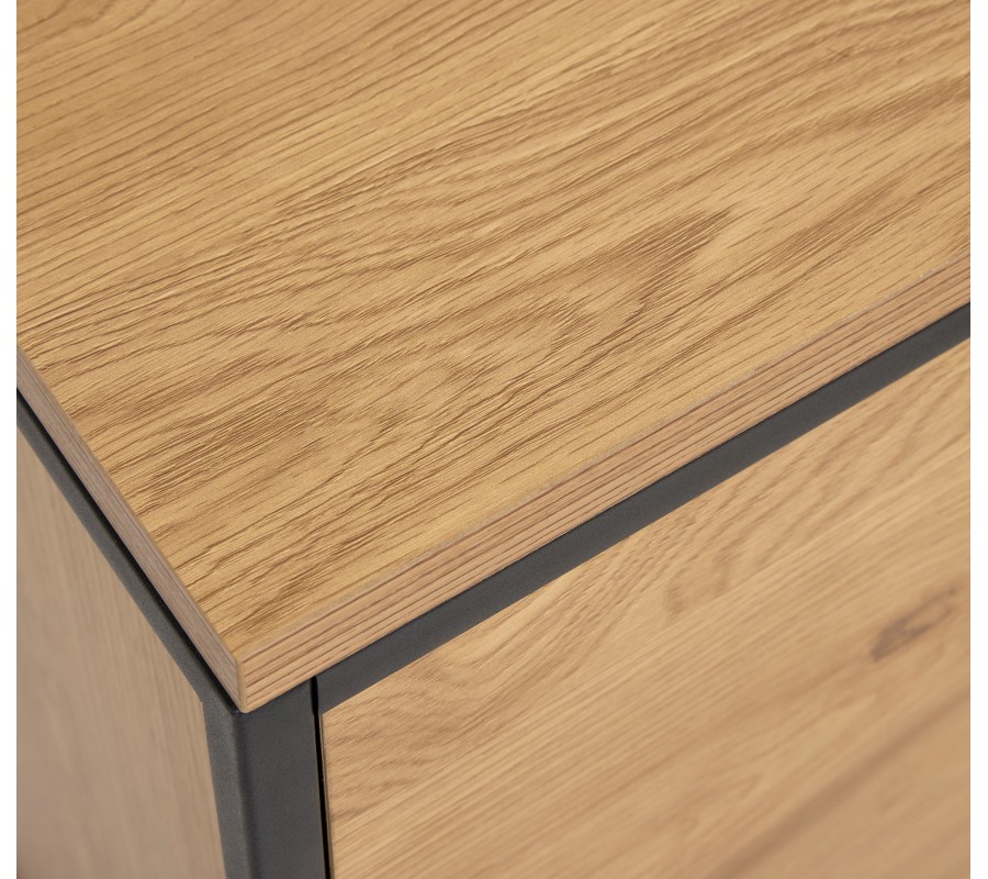 Příborník je vyroben z dýhy s melaminovým povrchem, který jí zaručuje výbornou odolnost vůči oděru, teplu a vlhkosti. Provedení ve světlé hnědé dubové barvě s jemnou pravidelnou kresbou letokruhů působí teplo a vyvažuje rám z kovu v černé barvě.