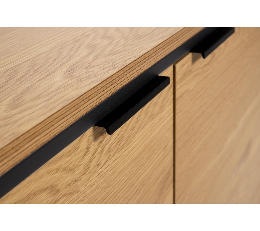 Úložný prostor má obdélníkový tvar a uzavírá se dvojitými dvířky s jednoduchými horizontálními úchyty. Kovová konstrukce lemuje rohy nábytku a plynule přechází až do spodní části v podobě dvou nožiček ve tvaru U. Zvýrazňuje moderní siluetu a její štíhlé linie v kombinaci se světlým dřevem působí odlehčeně.
