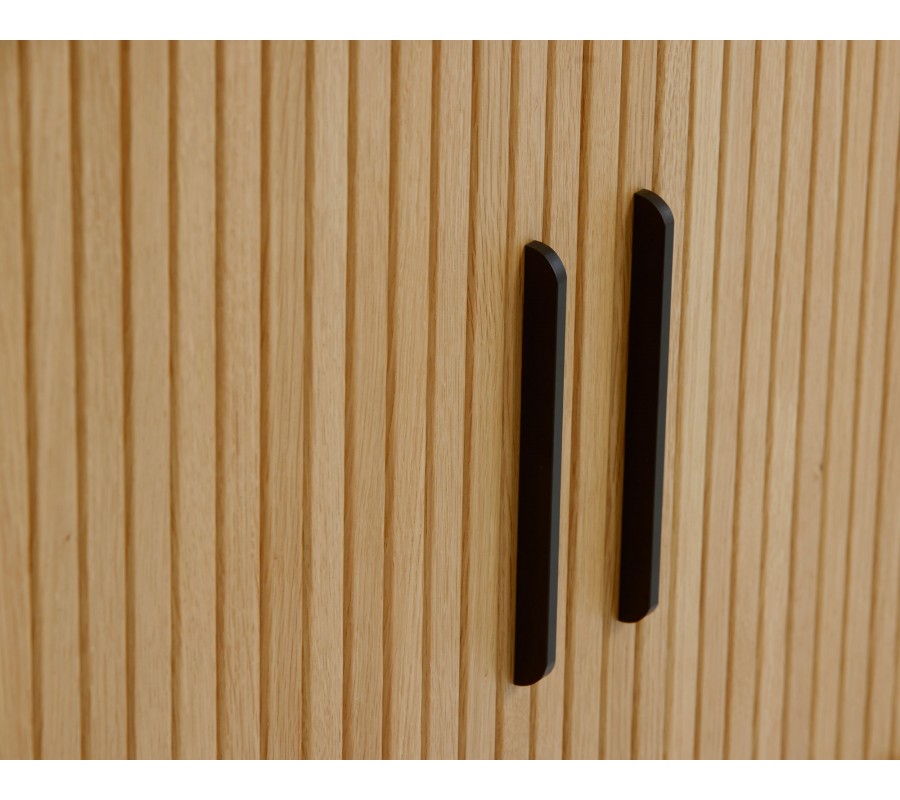 Nožičky mají štíhlý válcovitý profil a vizuálně odlehčují mohutnou úložnou část. Jsou vyrobeny z kovu v matném černém provedení, který vytváří elegantní kontrast ke dřevu. Ladí s minimalistickými úchyty na dvířkách se svislou orientací, výborně korespondující s lamelovou strukturou.