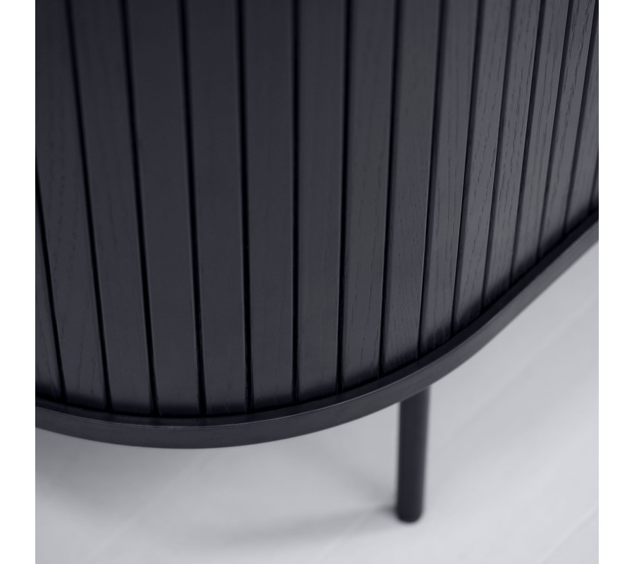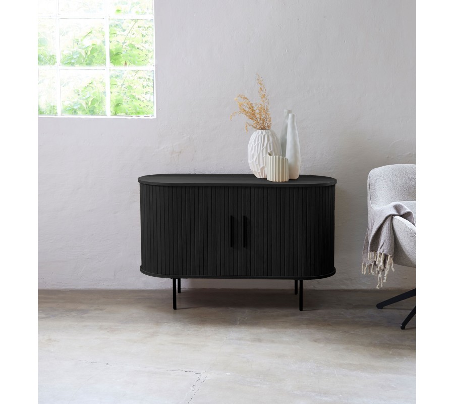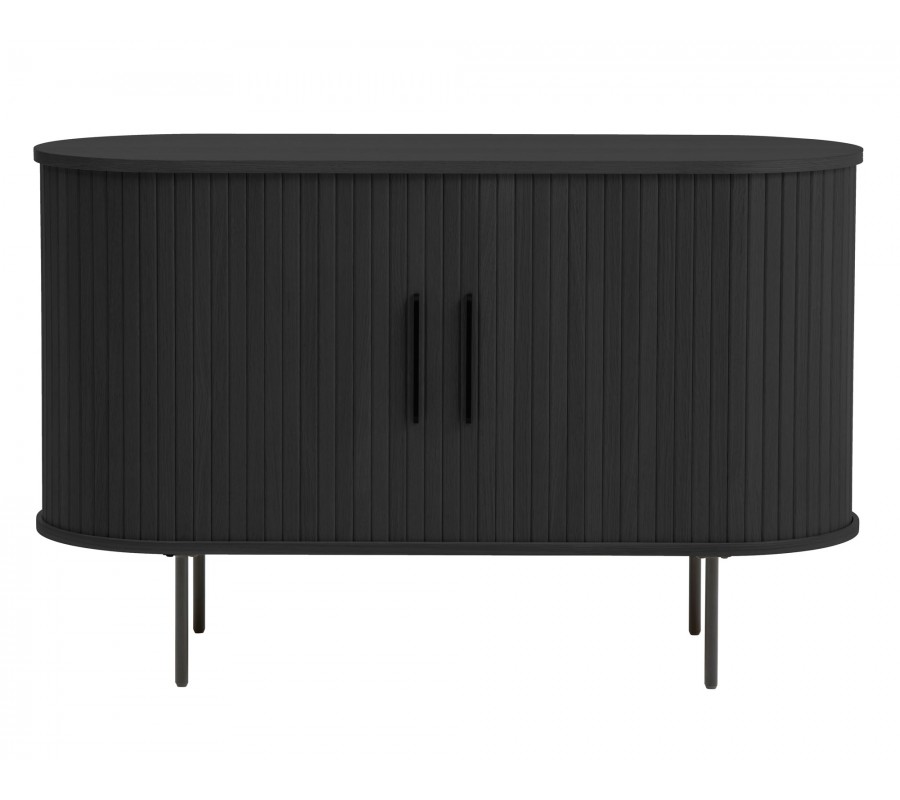 Moderní oválný příborník Bornholm se dvěma posuvnými lamelovými dvířky s kovovými úchyty a nohama v černé barvě 120 cm