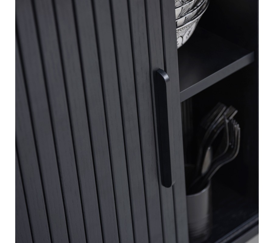 Příborník Bornholm propojuje moderní estetiku s retro prvky do nadčasového a elegantního celku. Univerzální černé provedení se snadno kombinuje s různými styly zařízení a kromě atraktivního vizuálu nabízí také praktický úložný prostor.