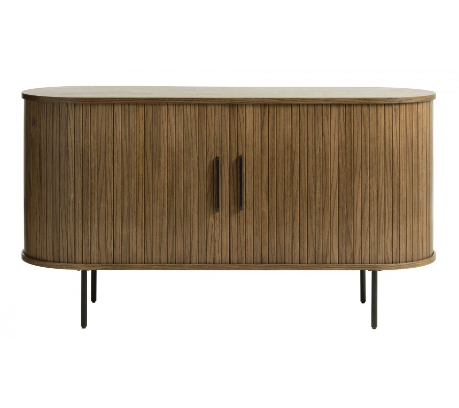 Retro tmavý hnědý dubový příborník Bornholm oválného tvaru se dvěma posuvnými dvířky s vertikálním lamelovým zdobením 140 cm