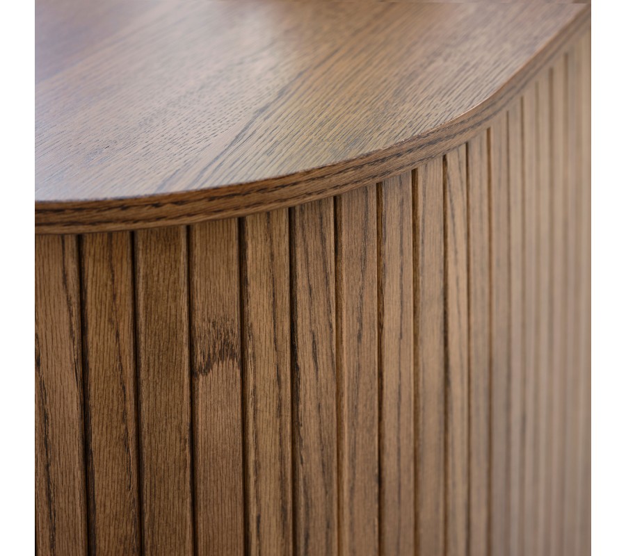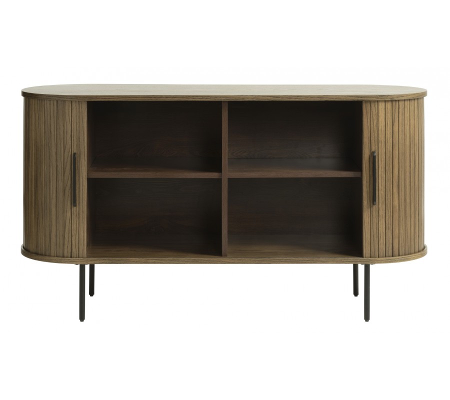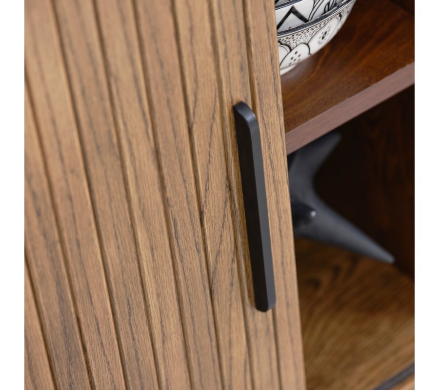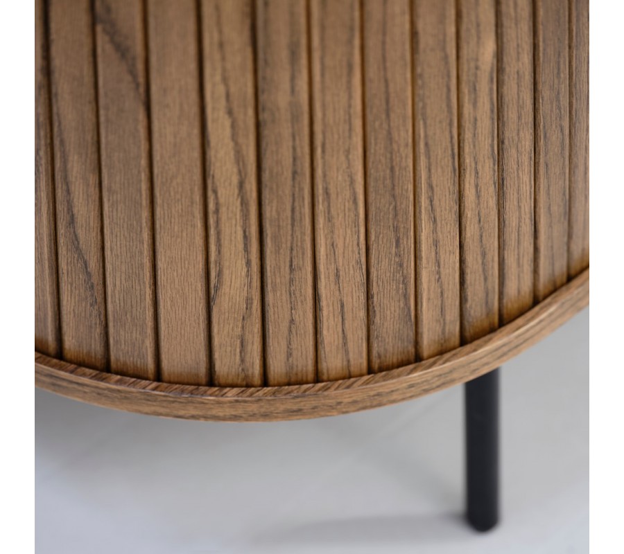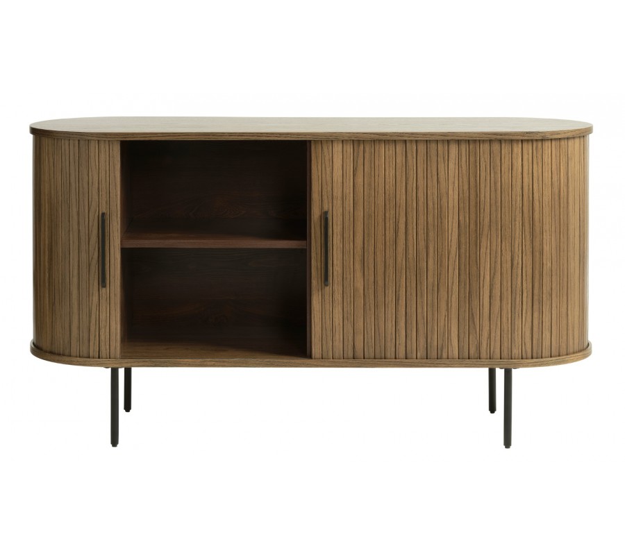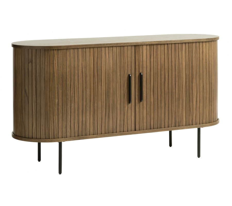 Úložná část má oválný tvar a je rozdělena pomocí vertikální a horizontální příčky na čtyři stejné police. Horní deska je hladká a nechává vyniknout strukturu dřeva, zatímco strany zdobí vertikální lamely inspirované retro stylem. Posuvná dvířka jsou přirozeně zakomponována do tohoto dekoru a doplňují je dlouhé štíhléúchytky.Příborník stojí na čtyř tenkých válcovitých nohách, což zajišťuje stabilitu i vizuální lehkost.