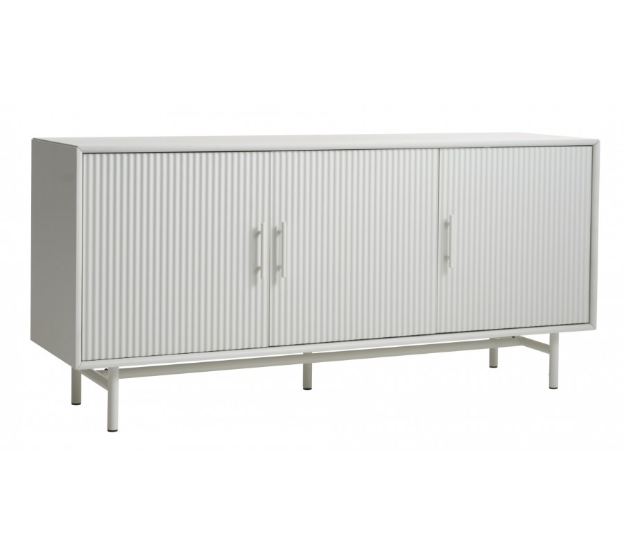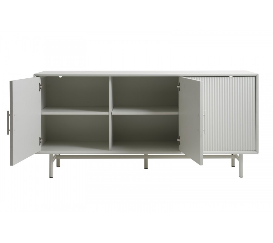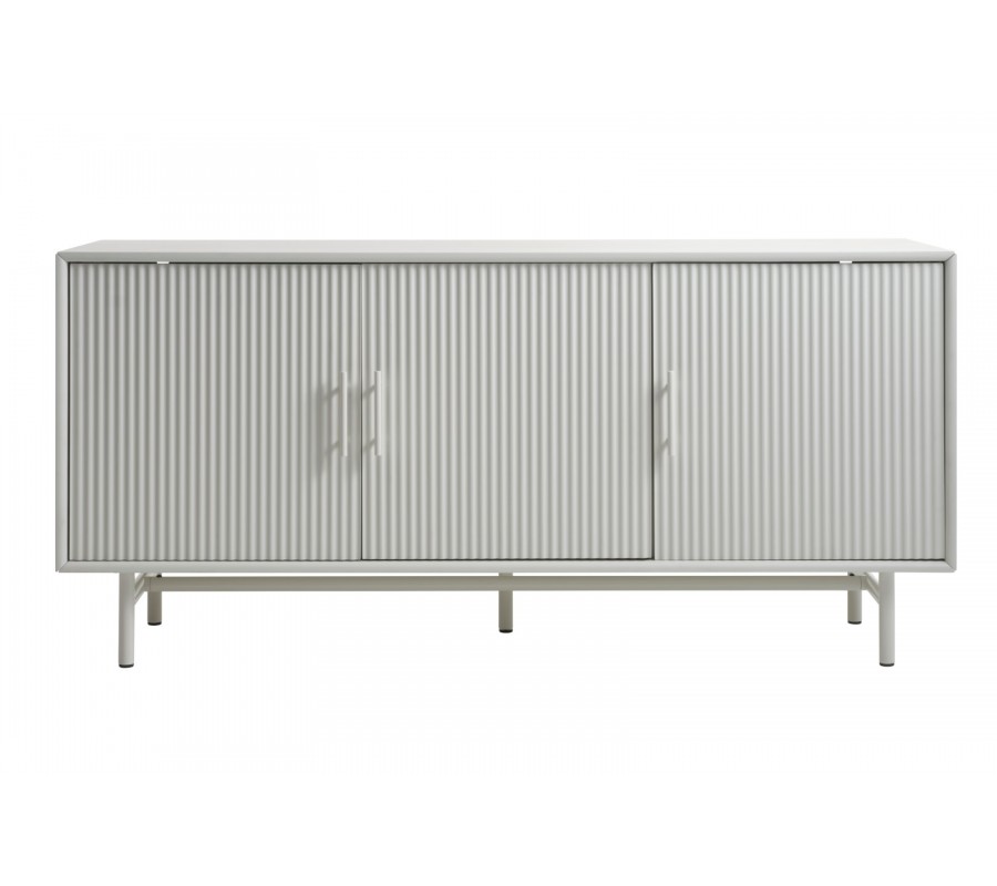 Moderní třídveřový příborník Hvidea s žebrovaným dekorem a kovovými nohami ve světlém béžově šedém provedení 160 cm