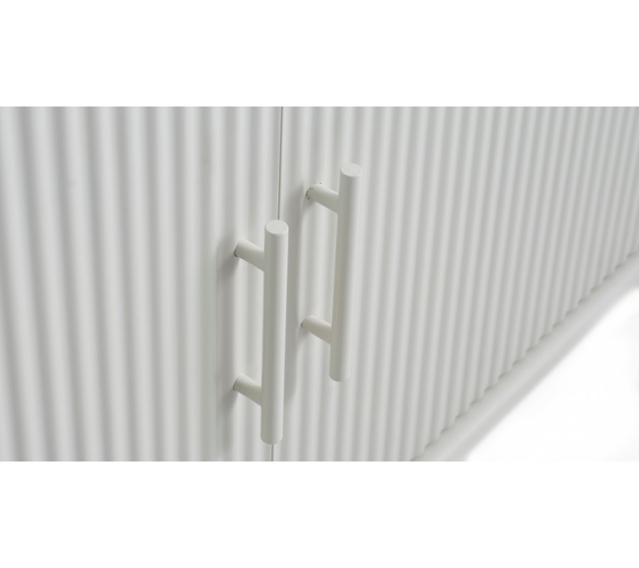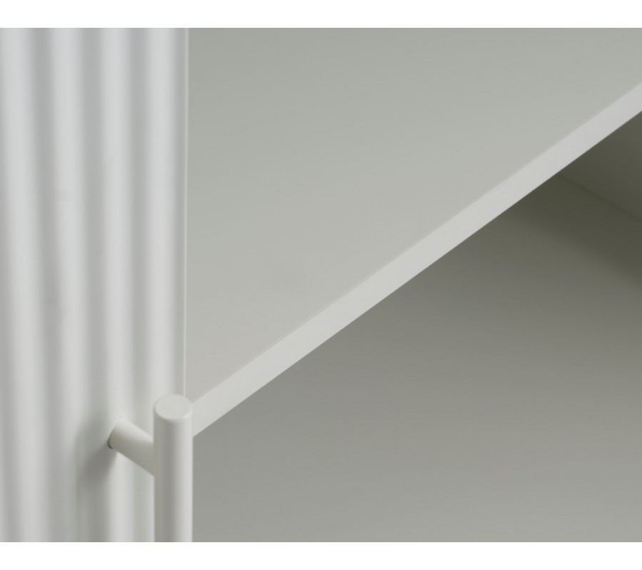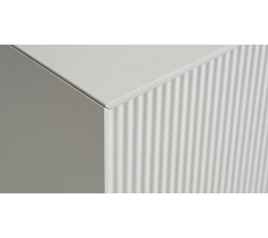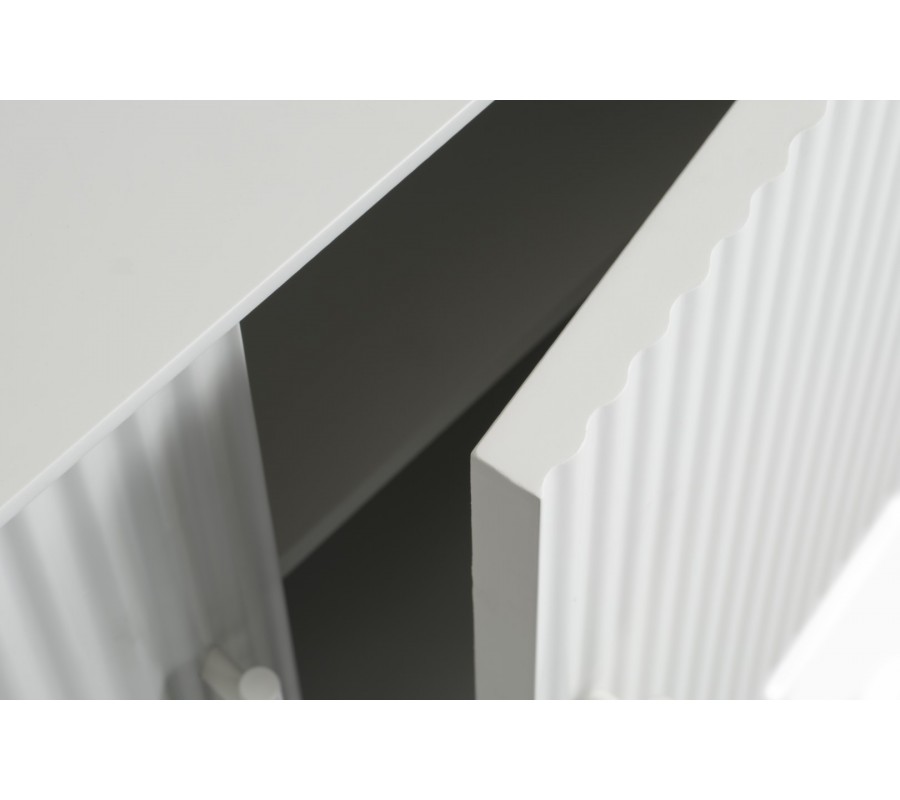 Design doplňují tři dvířka s dekorativním vertikálním žebrováním, která vytvářejí sofistikovaný art deco akcent. Otevírání zajišťují kovové úchyty se svislou orientací, tvarově sladěné s reliéfním dekorem. Ostatní plochy zůstávají hladké, což podtrhuje čistotu tvarů.